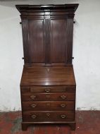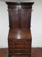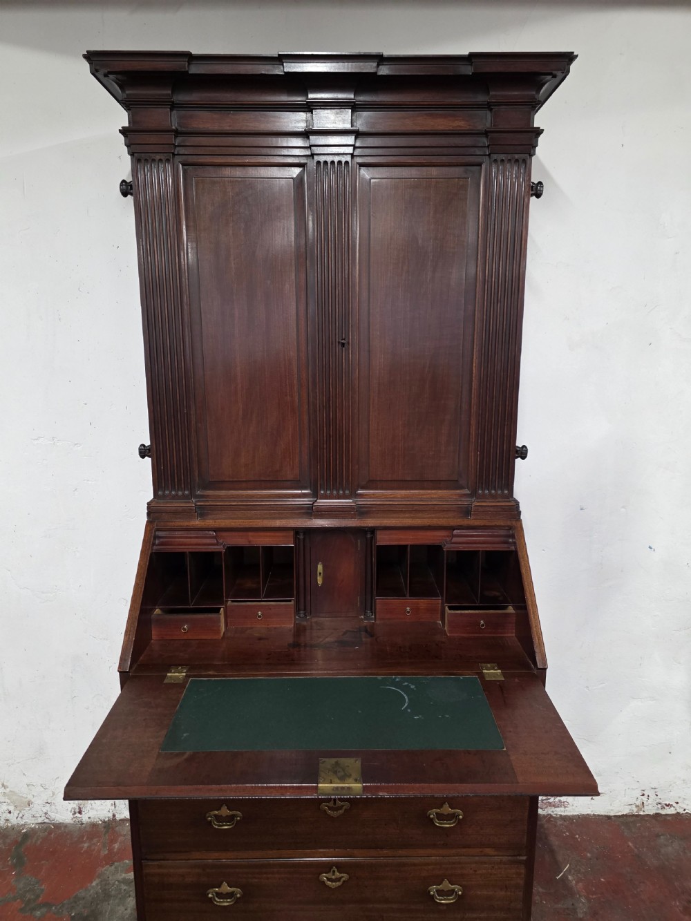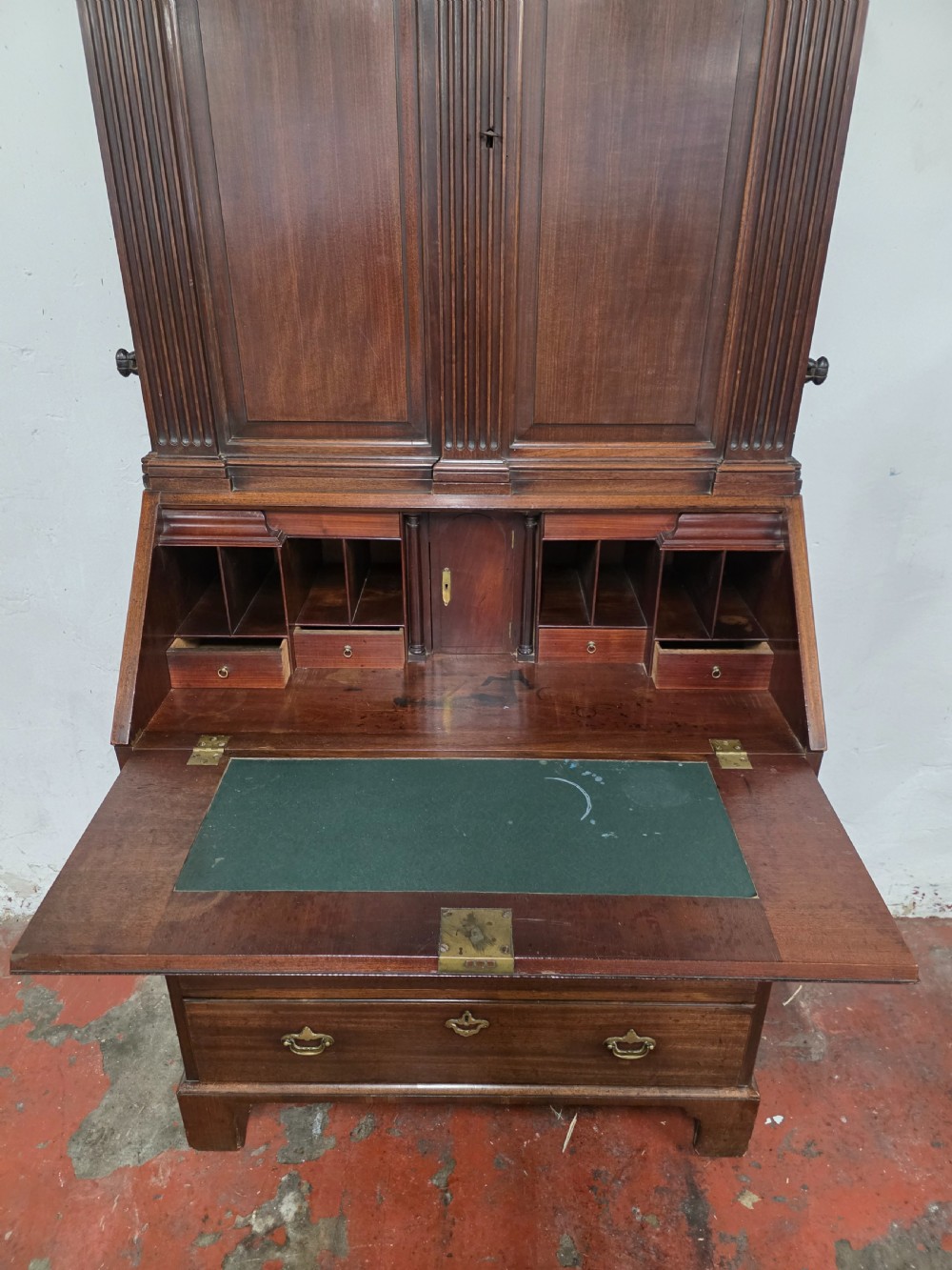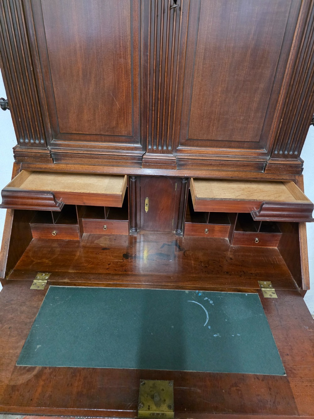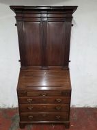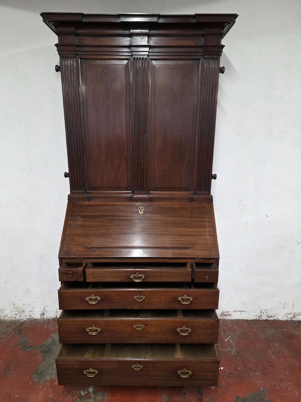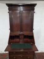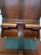 This piece of furniture provides ample of storage space for books and decorative items. Crafted from luxurious mahogany, this piece adds a touch of elegance to any room with its timeless design and intricate details. This piece of furniture is very practical for any home/office. Its has all orginal hardware throughout and oak lined with orginal reading book ledge and secret drawers to the interior. It also has unusual blacksmith made Iron hinges to the bookcase. A lovely piece of orginal Georgian furniture.