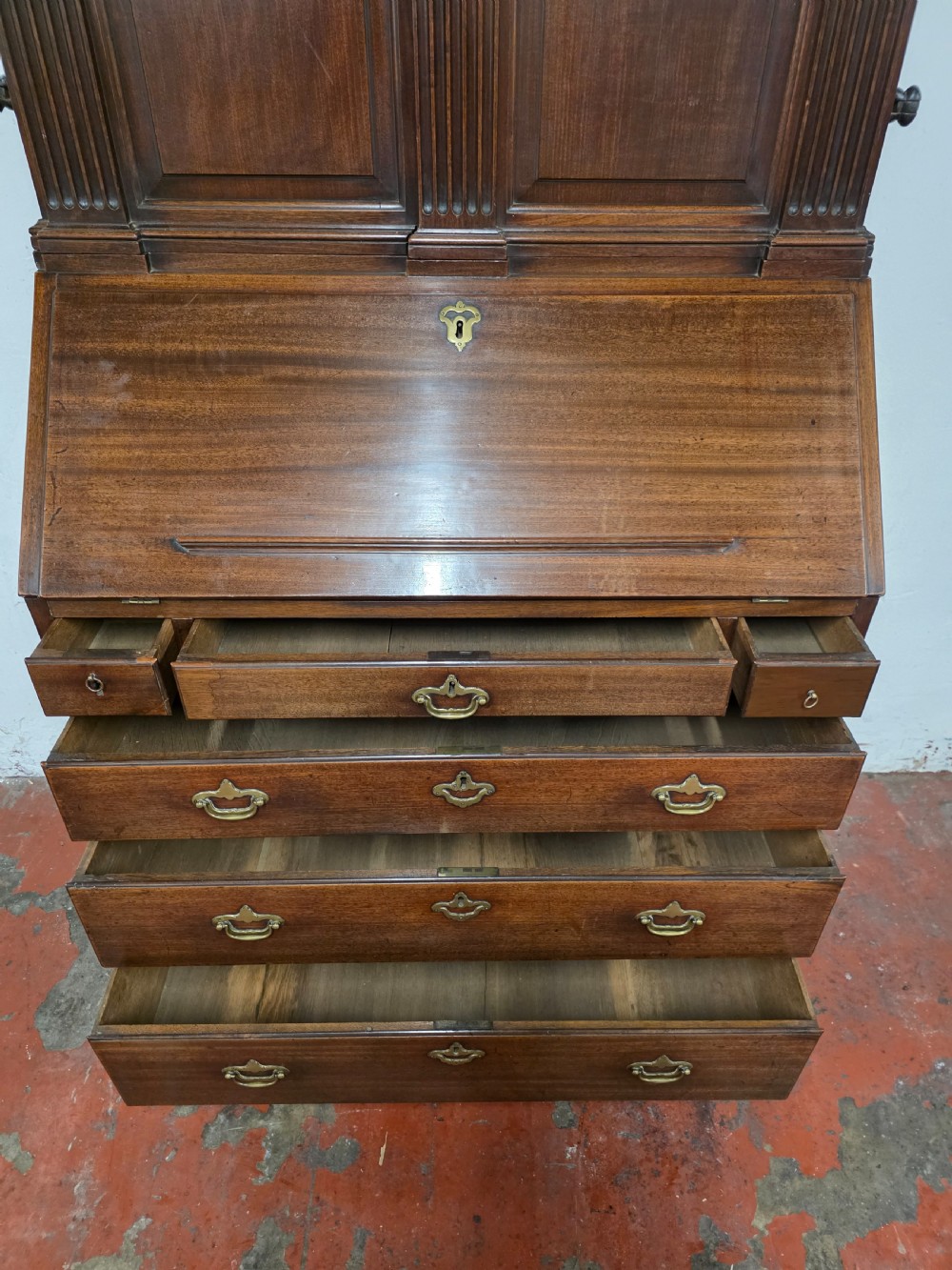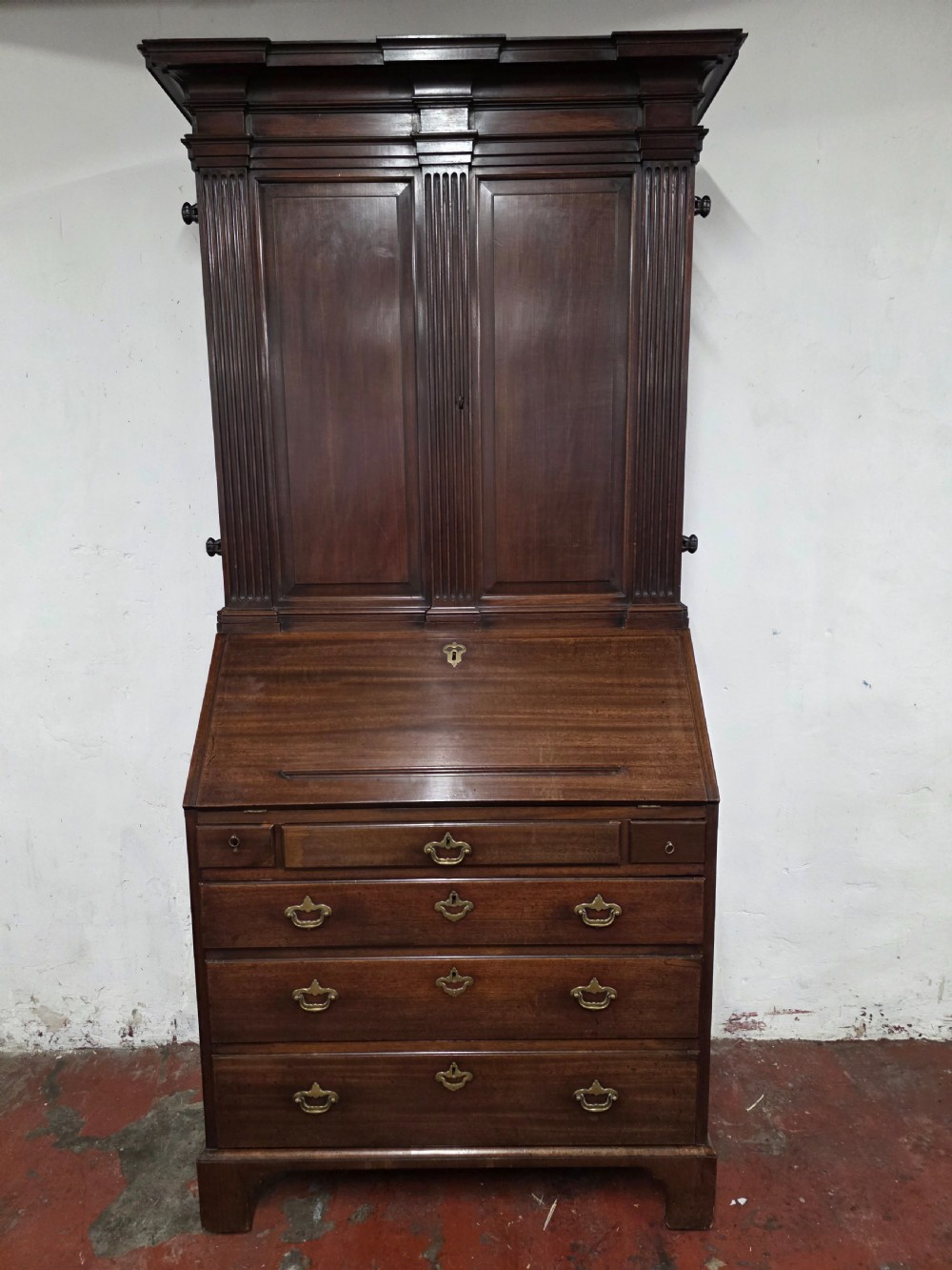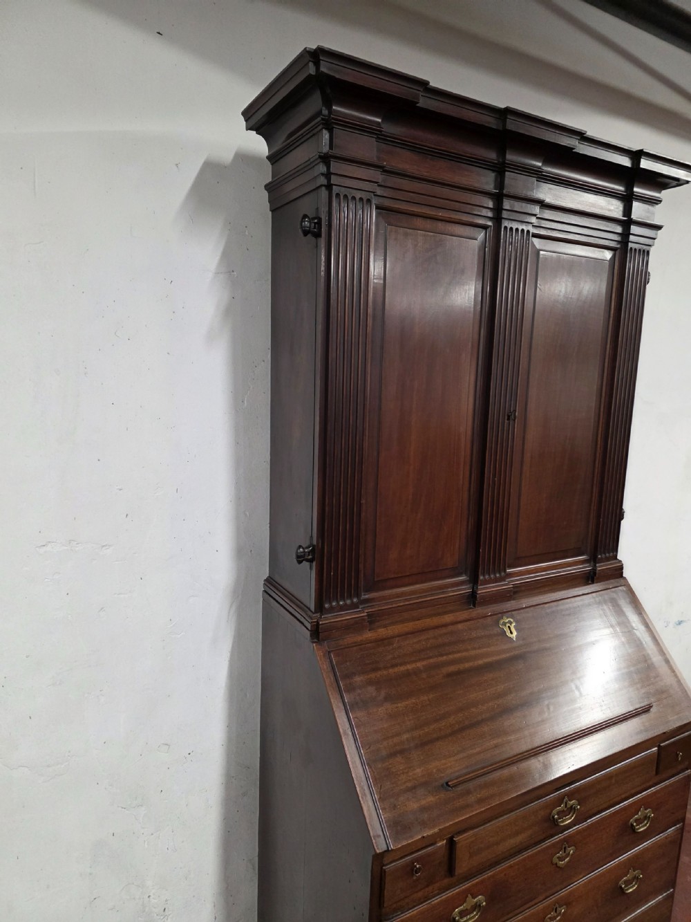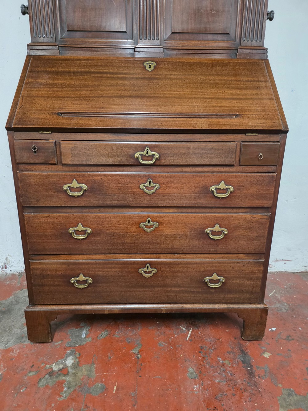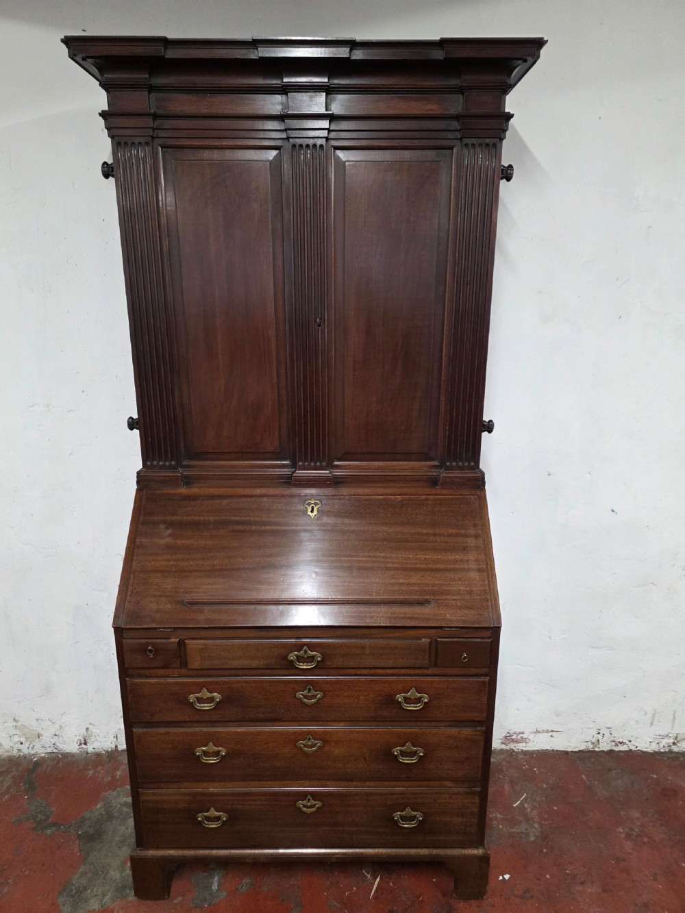This piece of furniture provides ample of storage space for books and decorative items. Crafted from luxurious mahogany, this piece adds a touch of elegance to any room with its timeless design and intricate details. This piece of furniture is very practical for any home/office. Its has all orginal hardware throughout and oak lined with orginal reading book ledge and secret drawers to the interior. It also has unusual blacksmith made Iron hinges to the bookcase. A lovely piece of orginal Georgian furniture.
