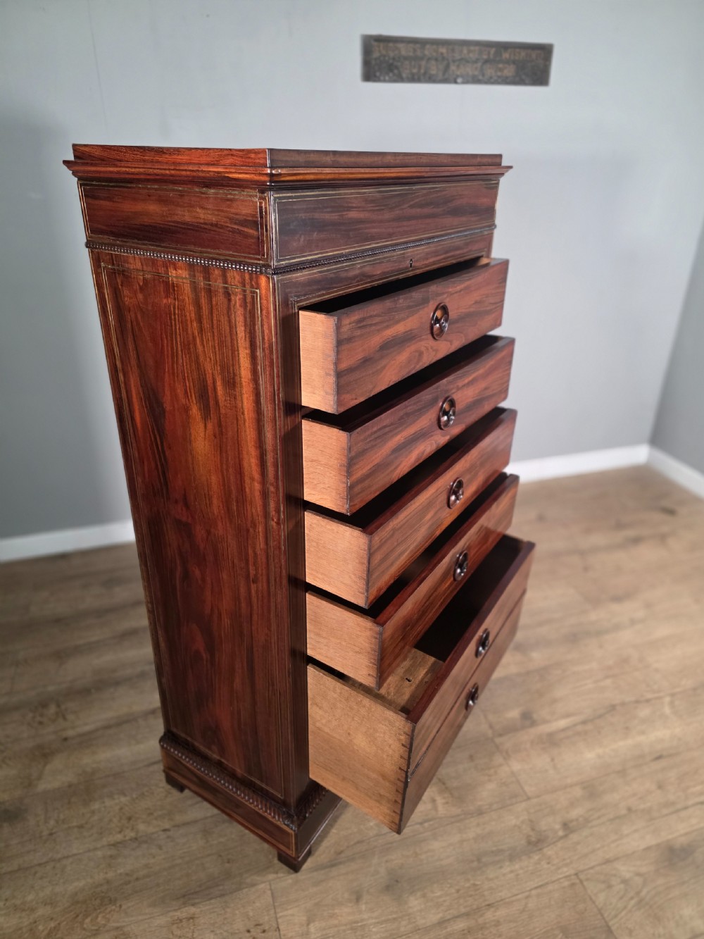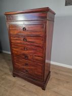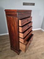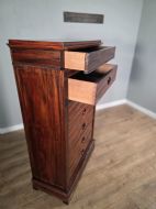 This piece of furniture exudes old-world charm and elegance. The chest of drawers are not only a stylish addition to any room but also offers ample storage space. The intricate brass inlays and rosewood construction adds a touch of luxury to this piece, making it a timeless and classic chocie for antique furniture enthusiasts.