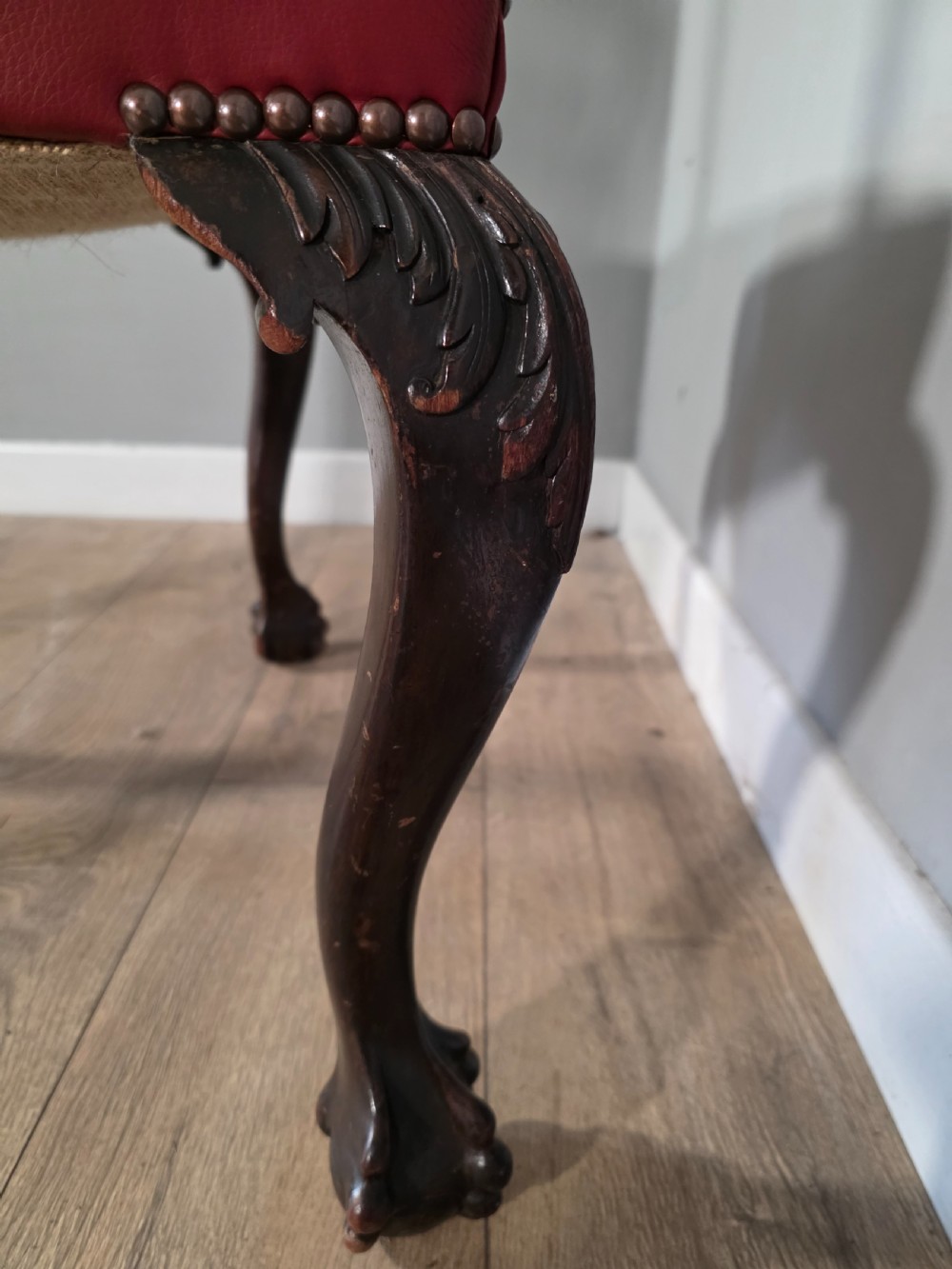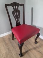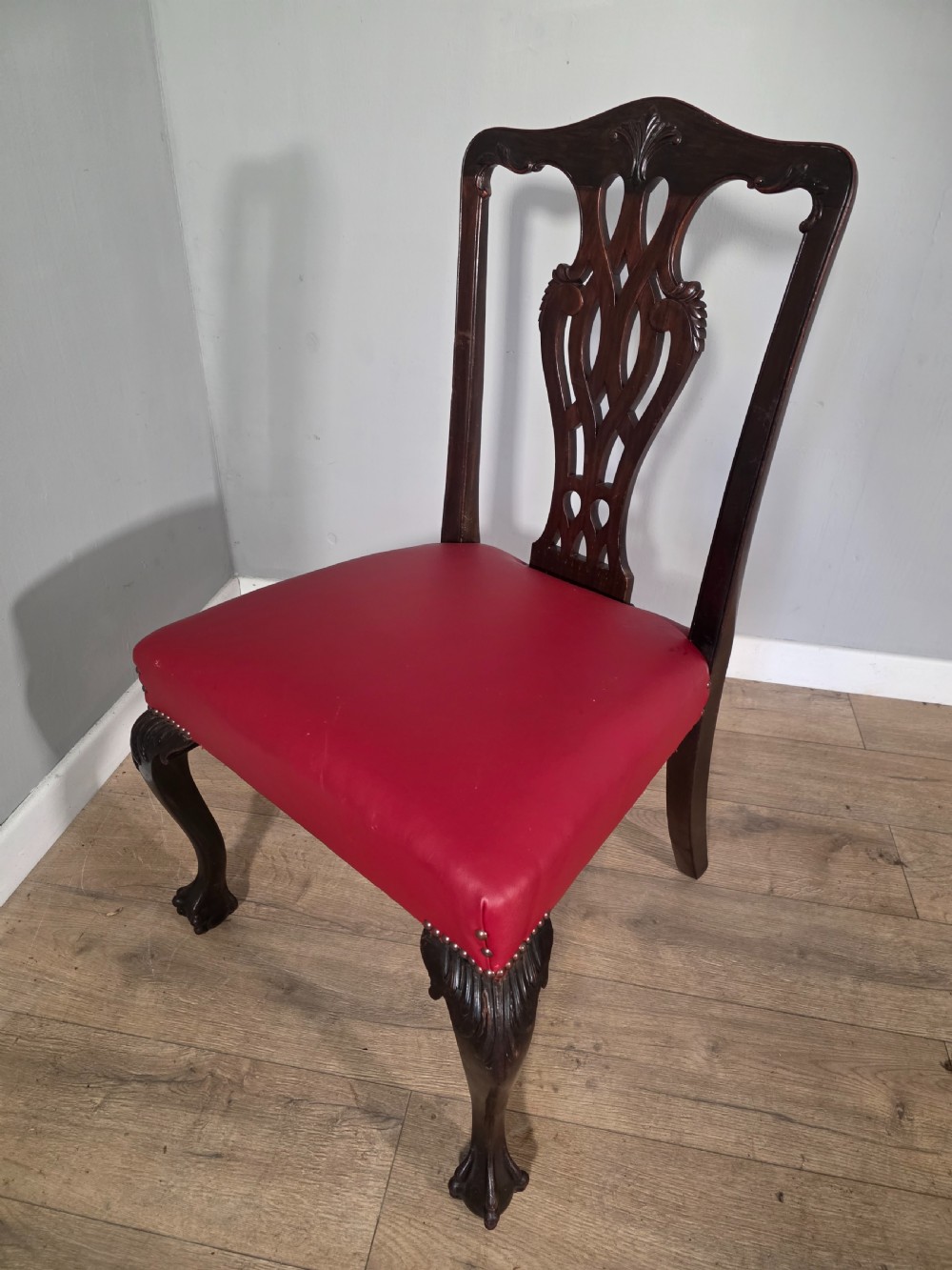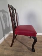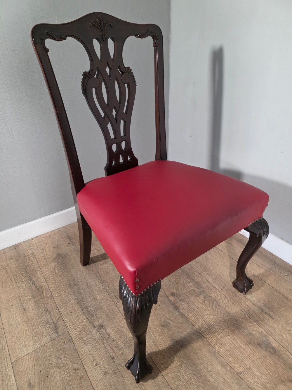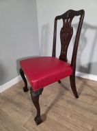 These chairs from the 1900s exudes classic elegance and sophistication. Crafted with attention to detail these chairs feature a rich mahogany and red leather seating material in a timeless chippendale style. These chairs are perfect for adding a touch of old world charm to any dining table. Ideal for those who appreciate vintage aesthetics and traditional craftsmanship. These chairs will make a real statement piece in your home.