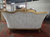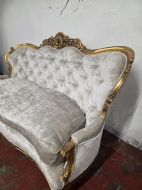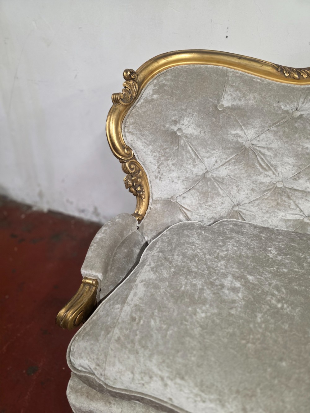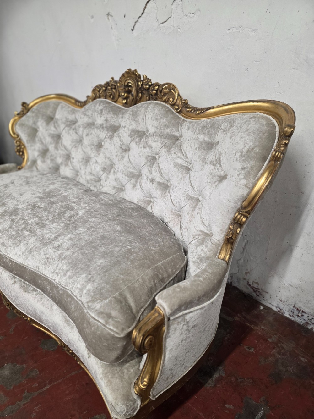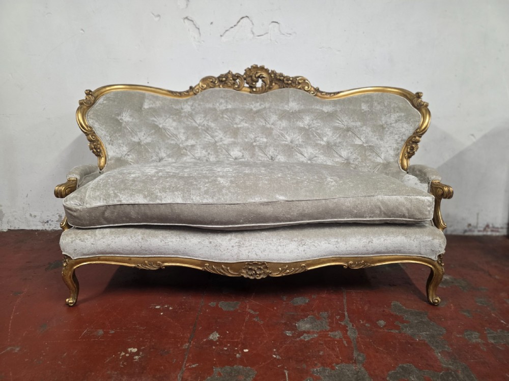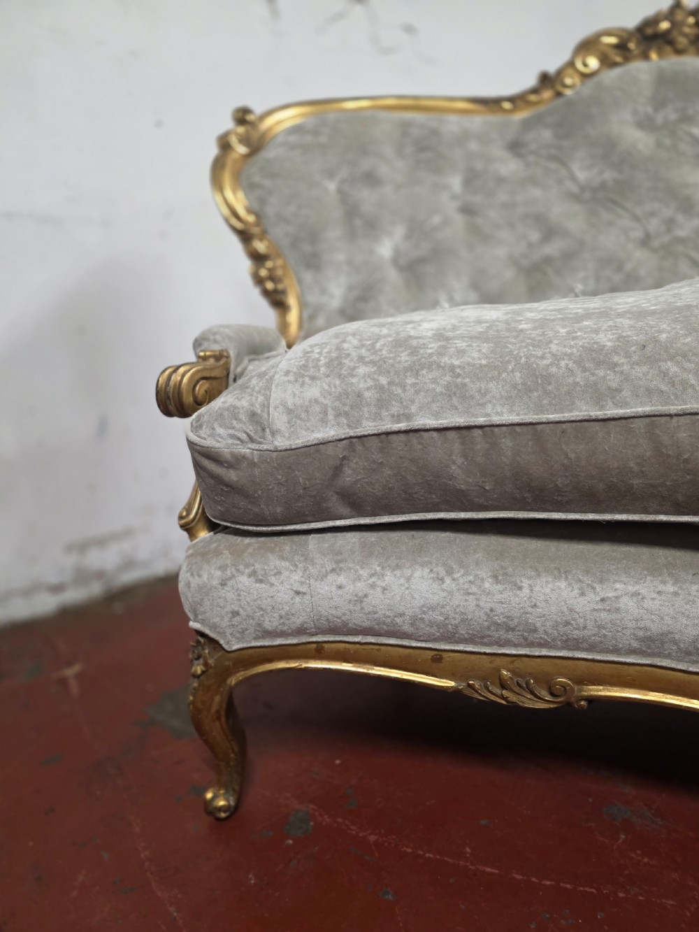 This antique Gilt Sofa from 1880s exudes elegance and sophistication. Fully reupholstered in contemporary fabric in a timeless grey colour. These Sofa are a very rare find.