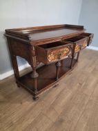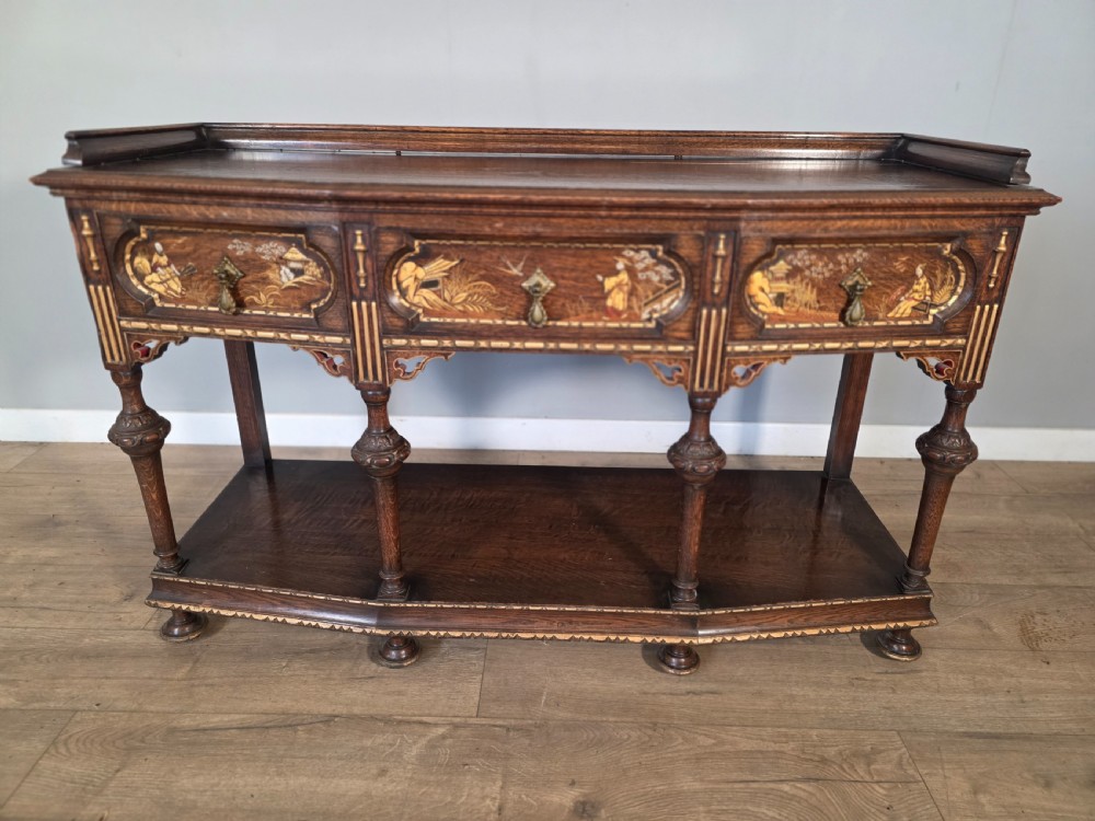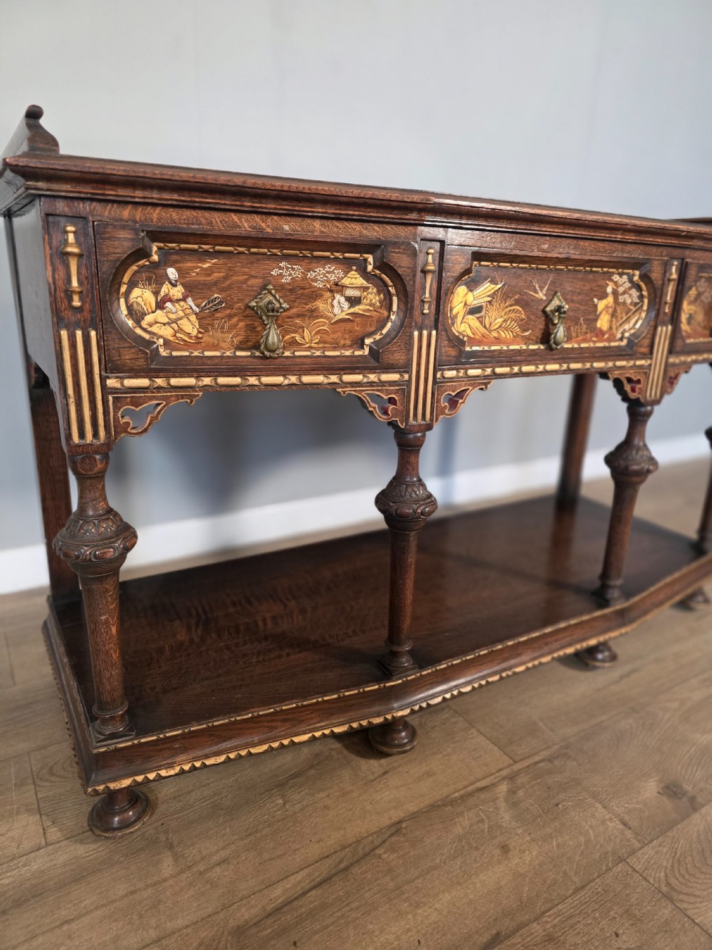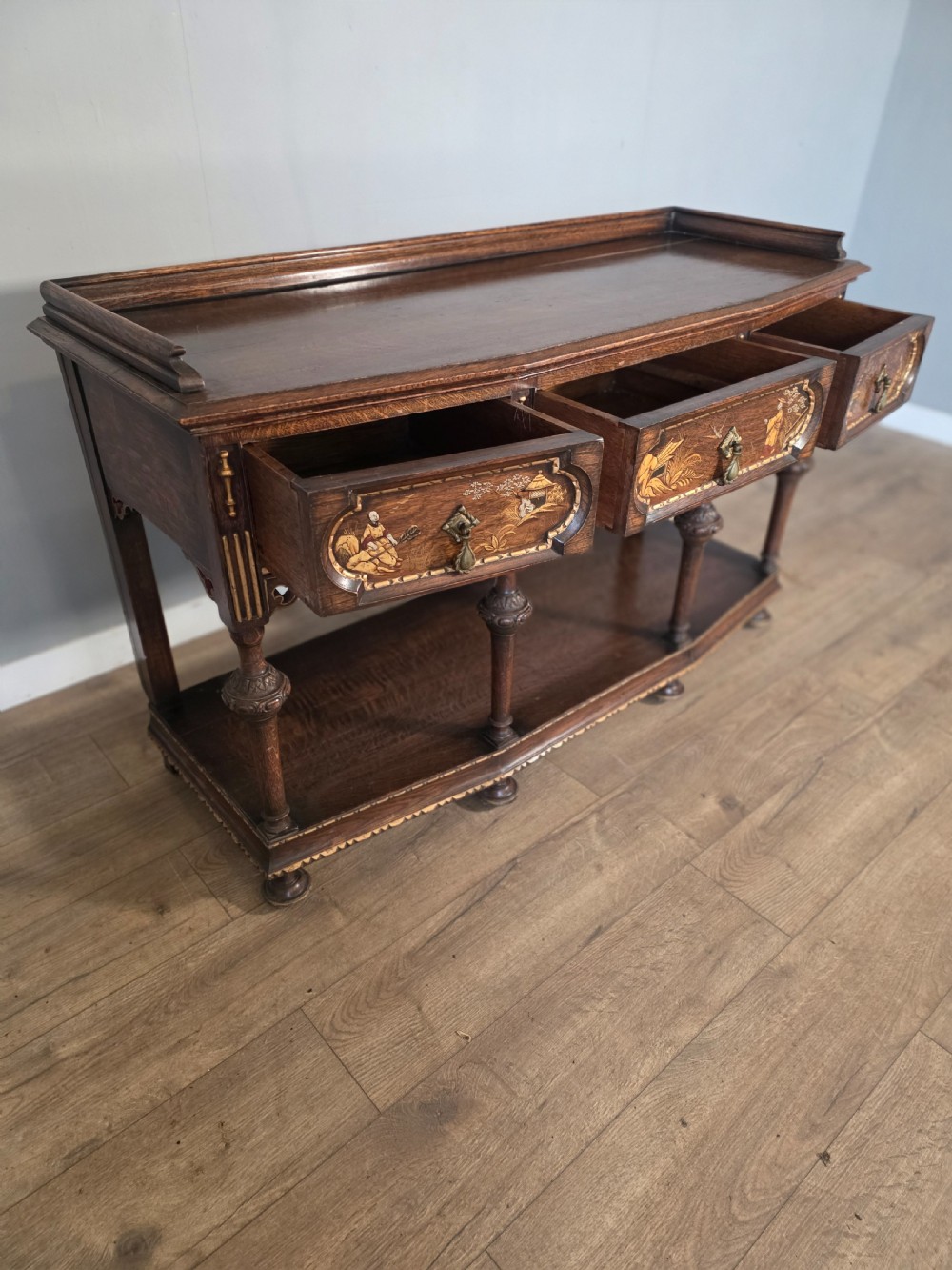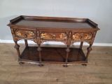 This antique solid oak console/serving table is a timeless piece of furniture. Crafted from sturdy oak, this console table exudes quality and character. Its antique design adds a touch of vintage charm to any room, making it perfect for serving or displaying items in style.