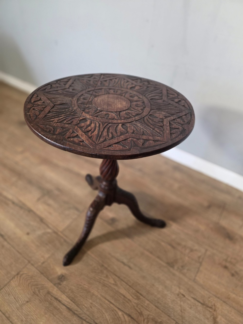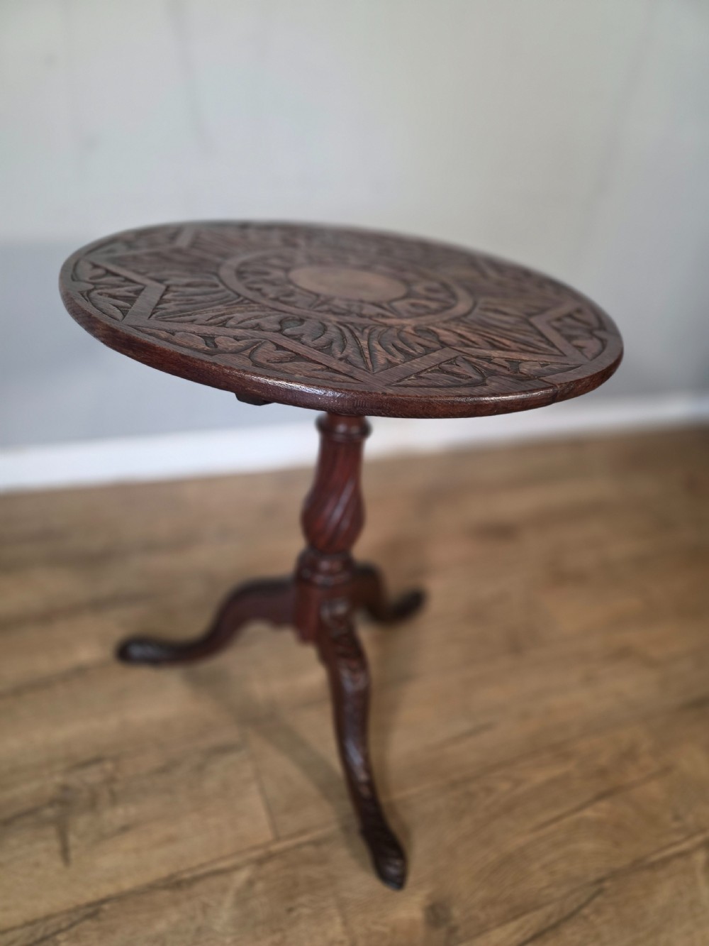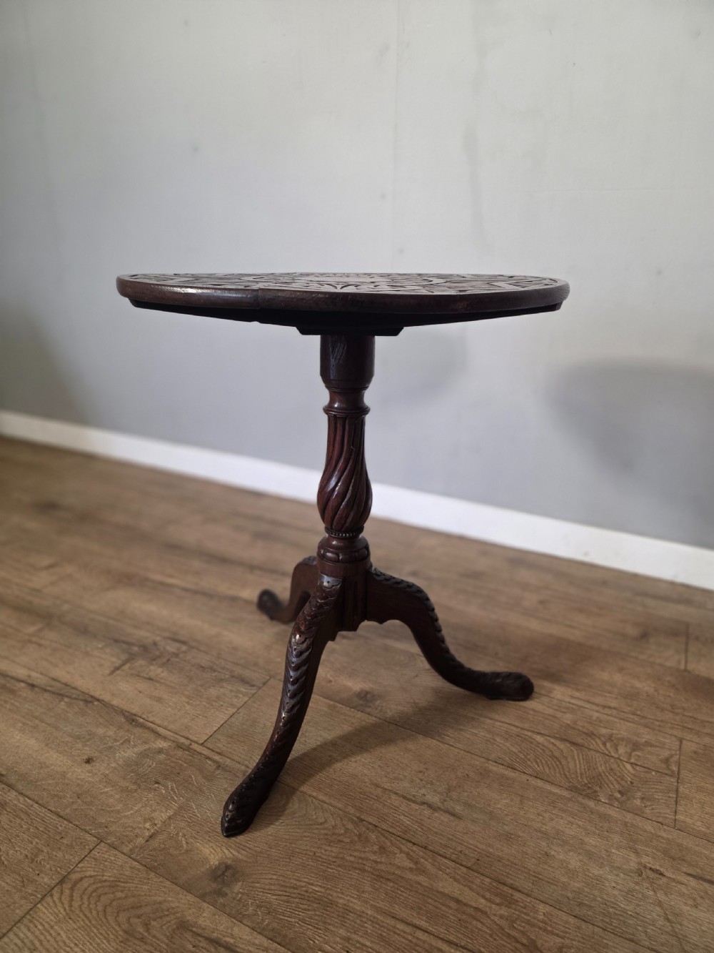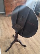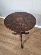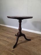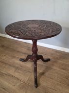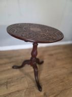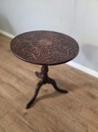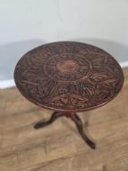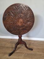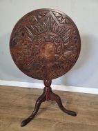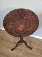 This piece of furniture exudes old world charm and its intricate carved details and classic tilt top design. This piece of furniture adds touch of classic elegance to any room. Its timeless design and craftmanship make it a standout piece for any antique collector or lover of traditional furniture.