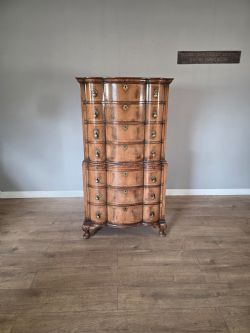 The drawers are cross-banded with mahogany, with 4 drawers to the bottom and 5 dummy drawers above with a hinged lid for storage.