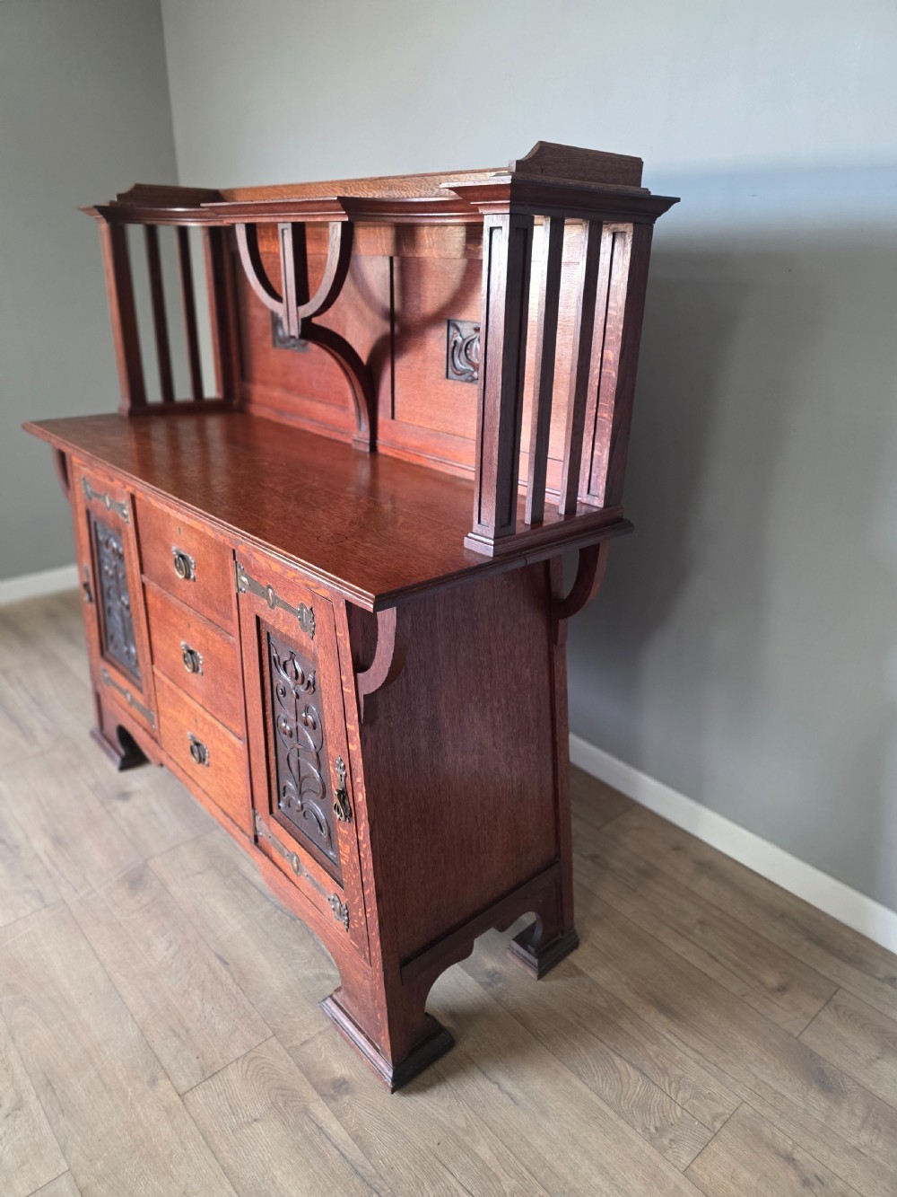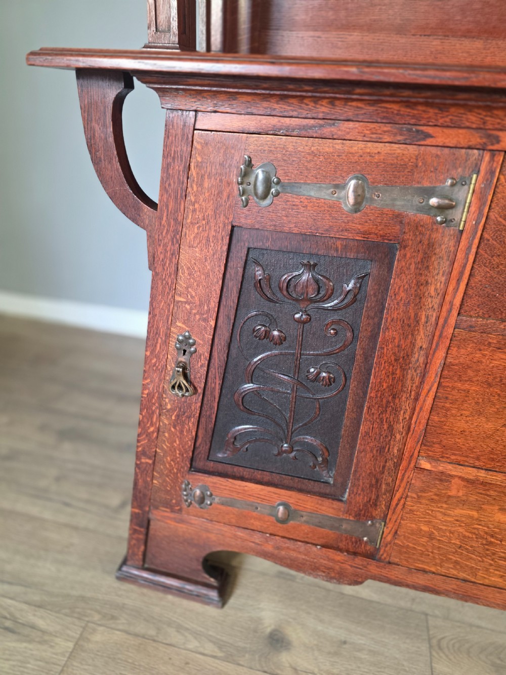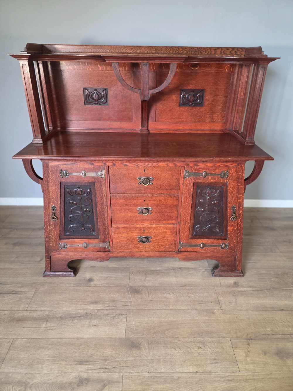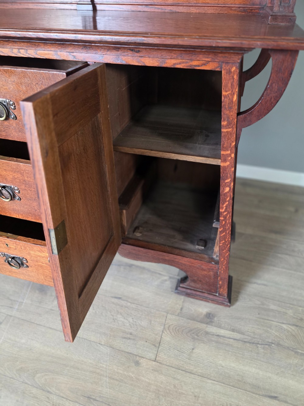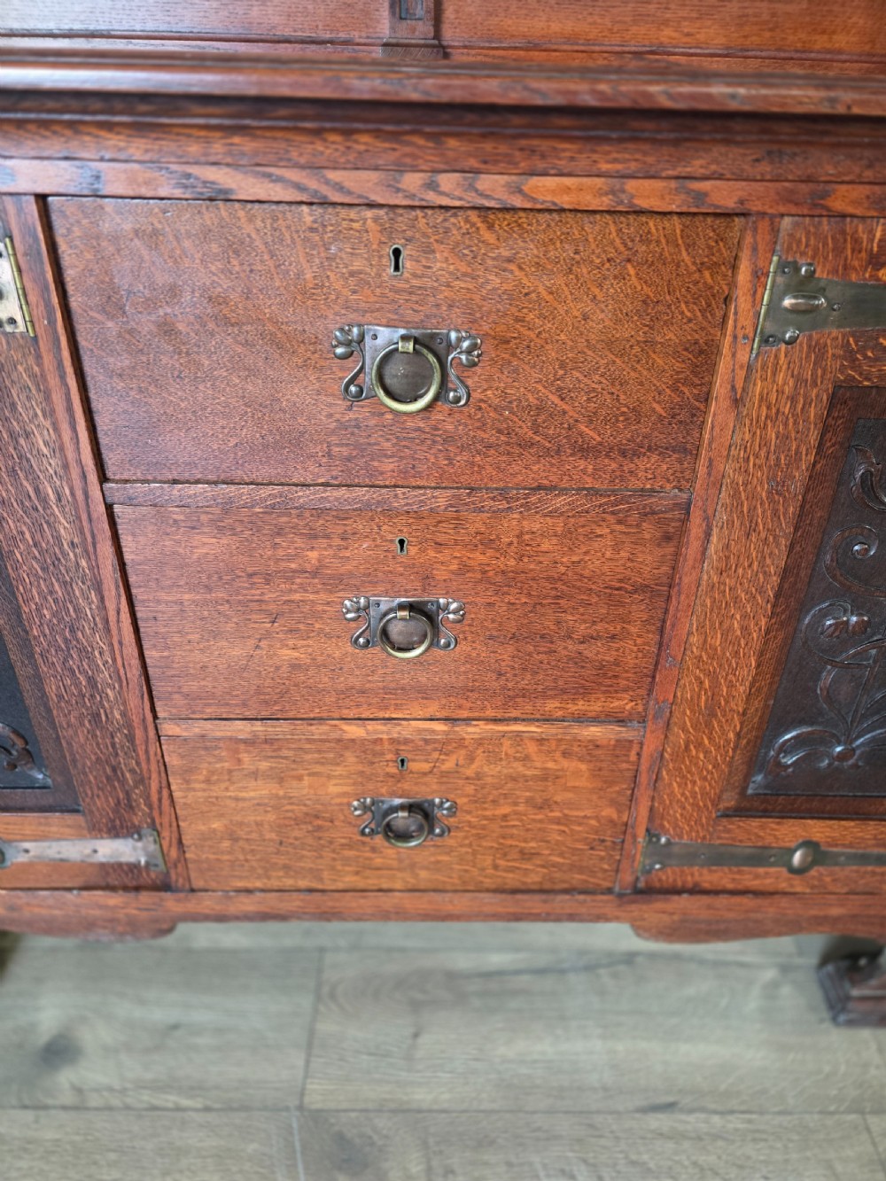 A beautiful crafted piece of furniture from the late 19th century. Made from solid oak with 3 drawers and 2 cupboards for fabulous storage space. The sideboard has beautiful carved flowers to the doors, great shape, sloping sides and lovely brass hardware. All drawers and cupboards are fully working. A great piece of furniture ready to be used.