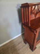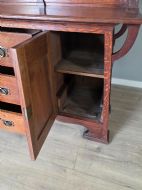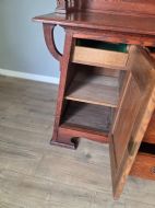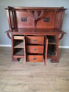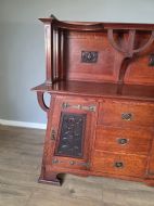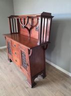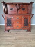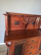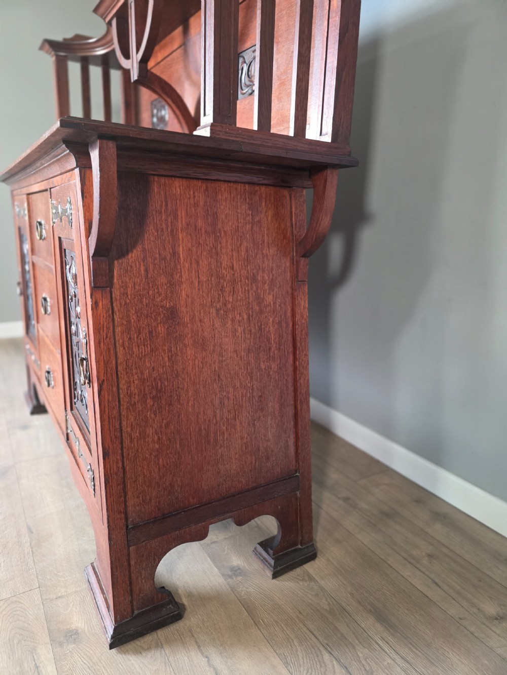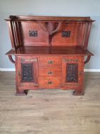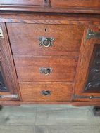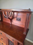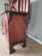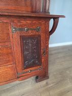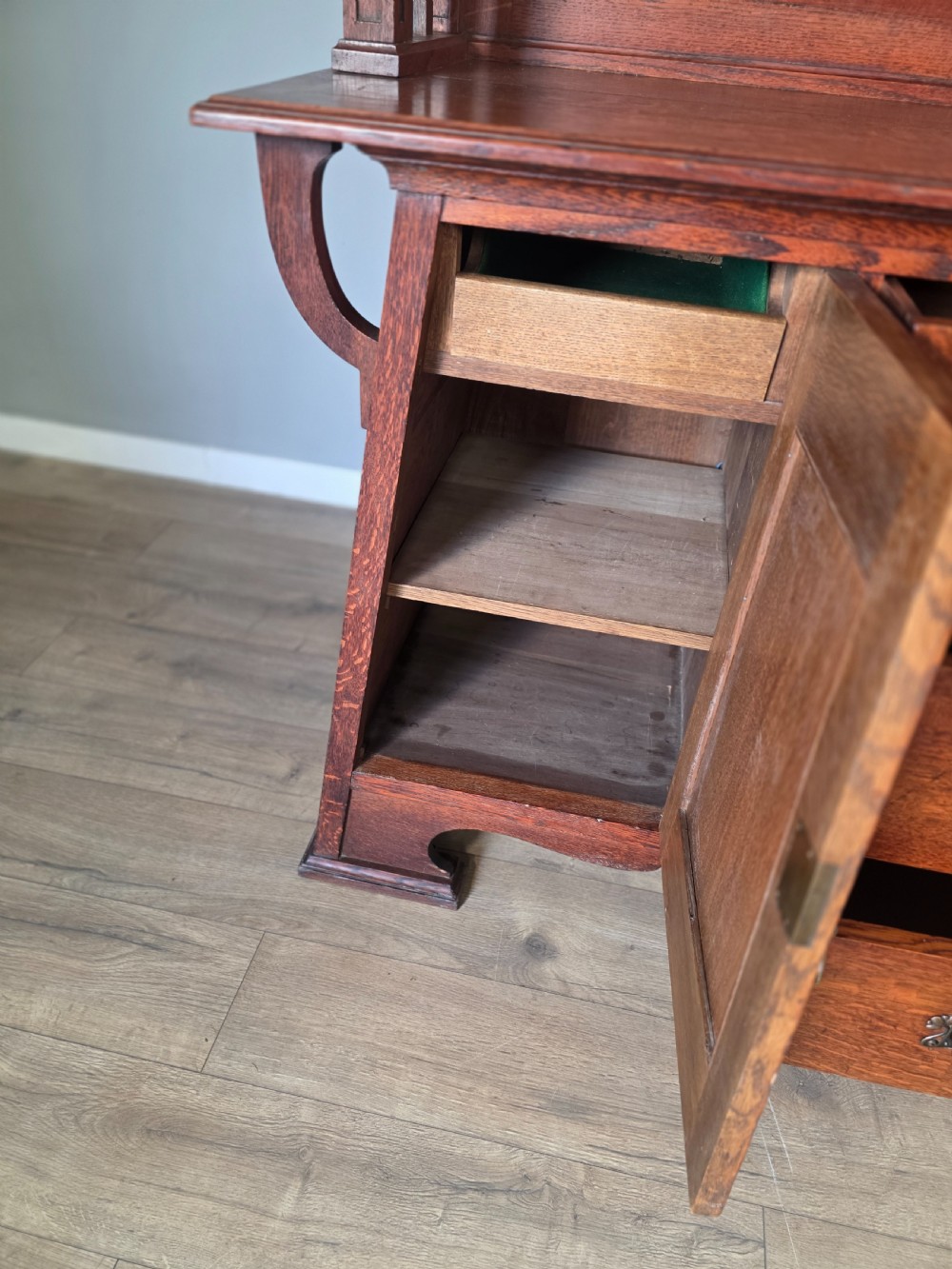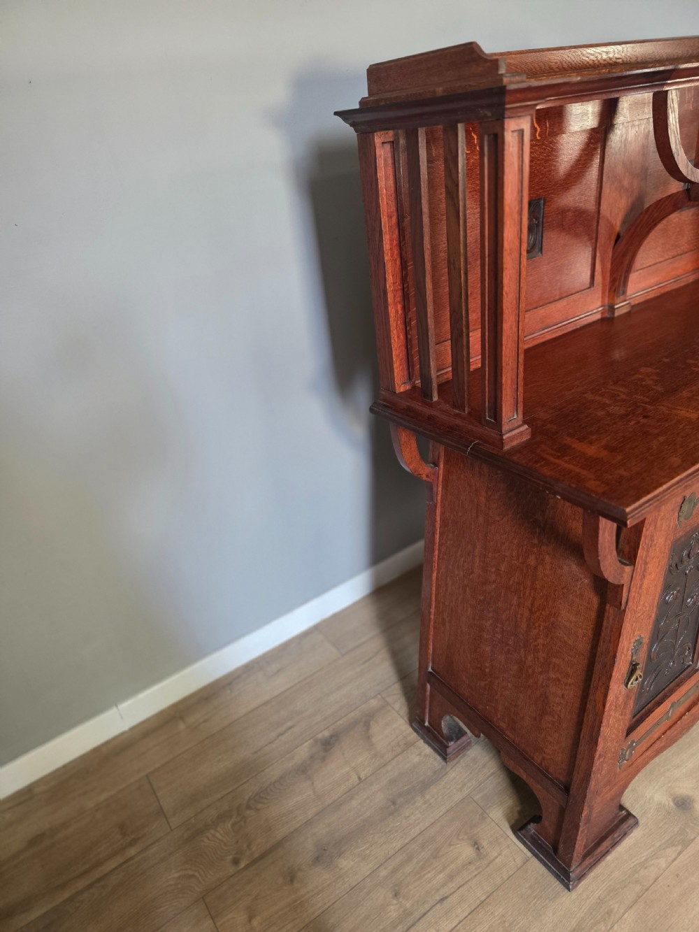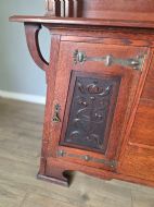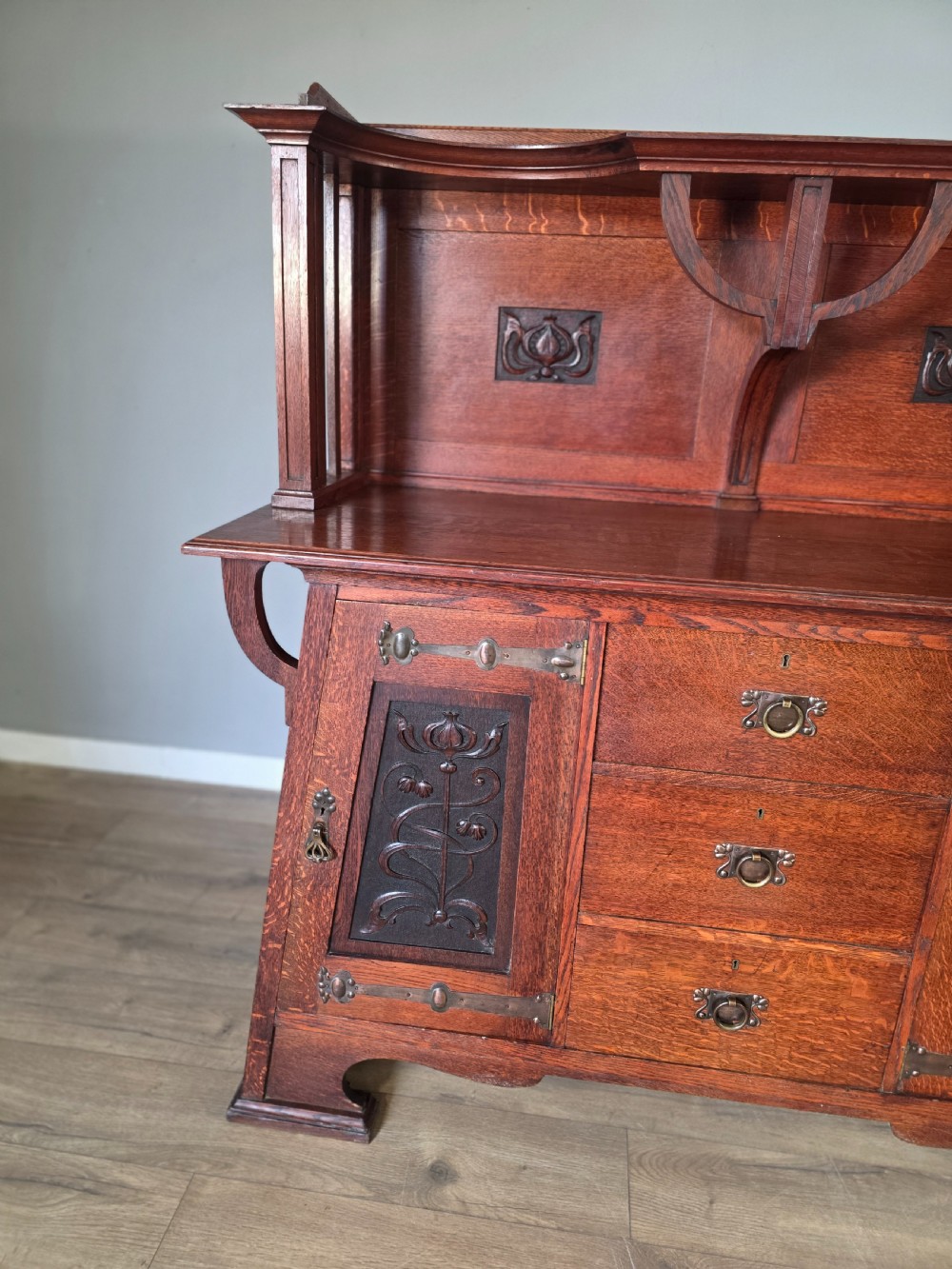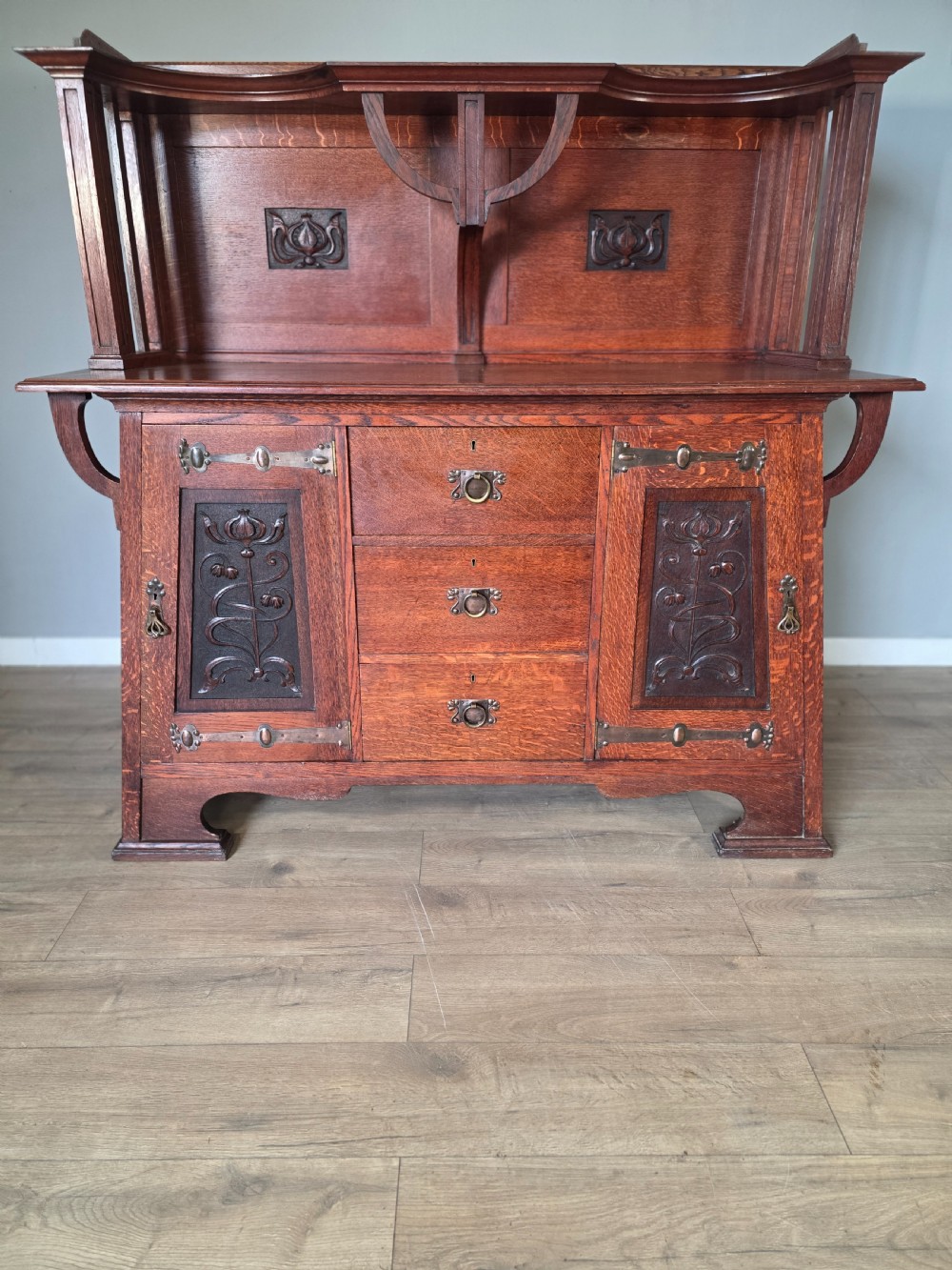 A beautiful crafted piece of furniture from the late 19th century. Made from solid oak with 3 drawers and 2 cupboards for fabulous storage space. The sideboard has beautiful carved flowers to the doors, great shape, sloping sides and lovely brass hardware. All drawers and cupboards are fully working. A great piece of furniture ready to be used.