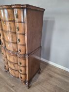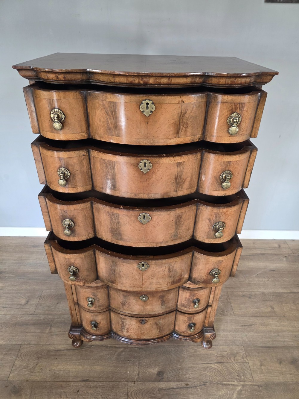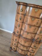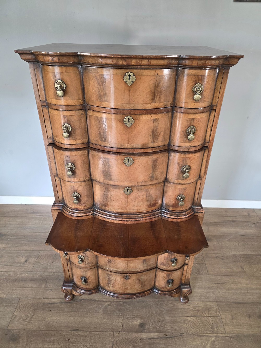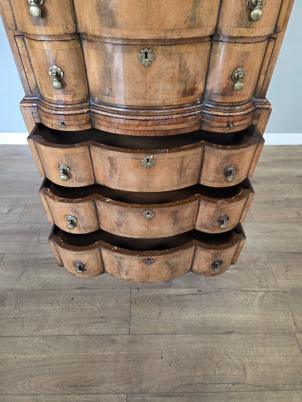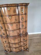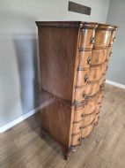 A classic and timeless piece of furniture perfect for adding a touch of elegance to any room. There is plenty of storage space as this chest comes with 7 drawers. The rich walnut finish and intricate detailing gives it a luxurious feel, making it a standout piece in any antique collection. The chest also comes with a brushing slide and splits into 2 sections for easy handling and transportation. There is one brass eschuion missing to the bottom drawer. Please see photos. Overall good condition and has faded to an excellent colour.