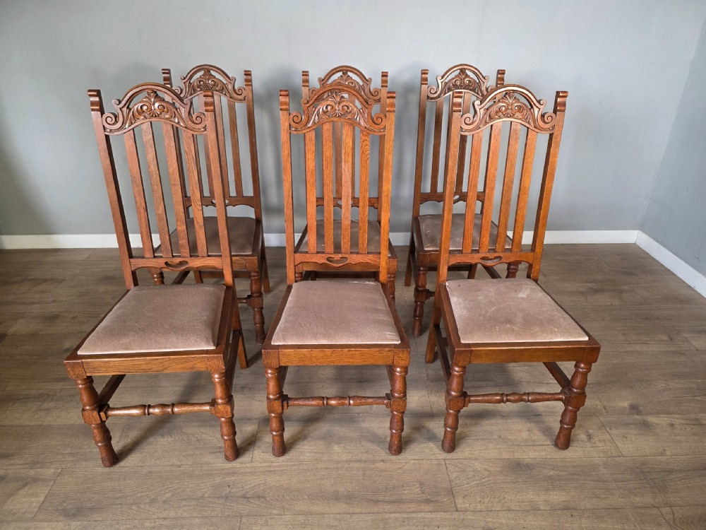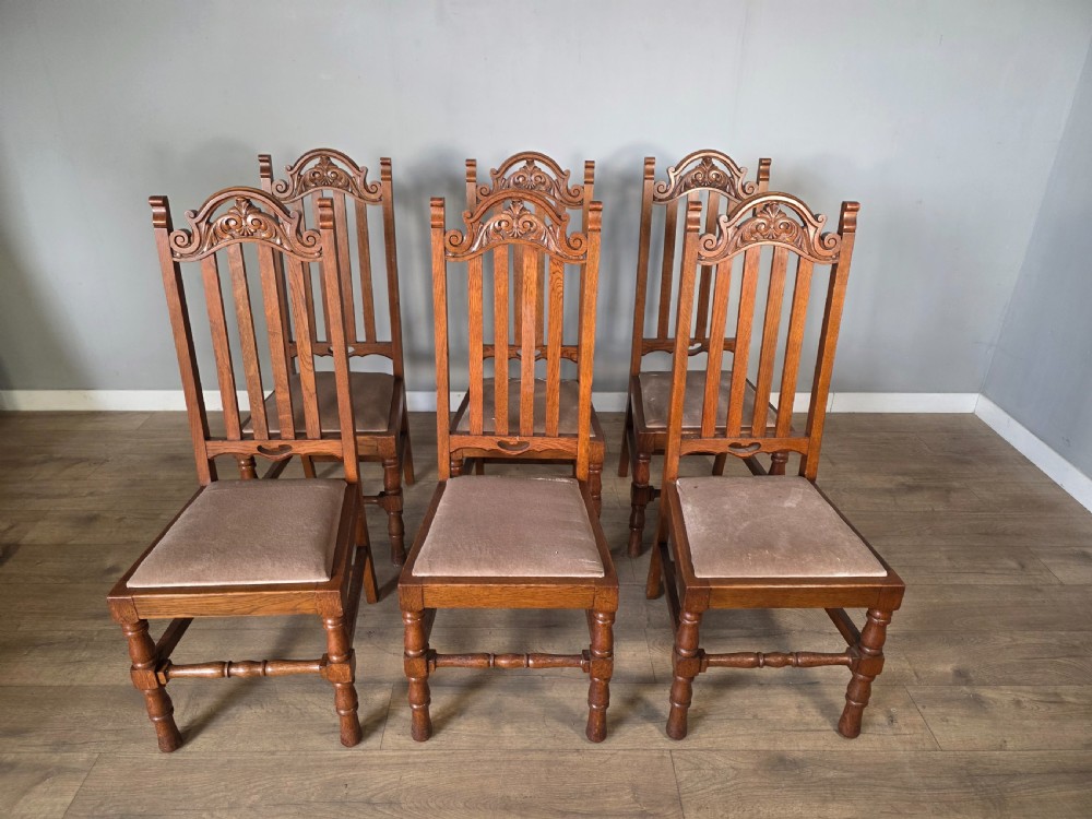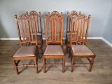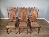 Set of 6 Antique Golden Oak High Back Carved Dining Chairs