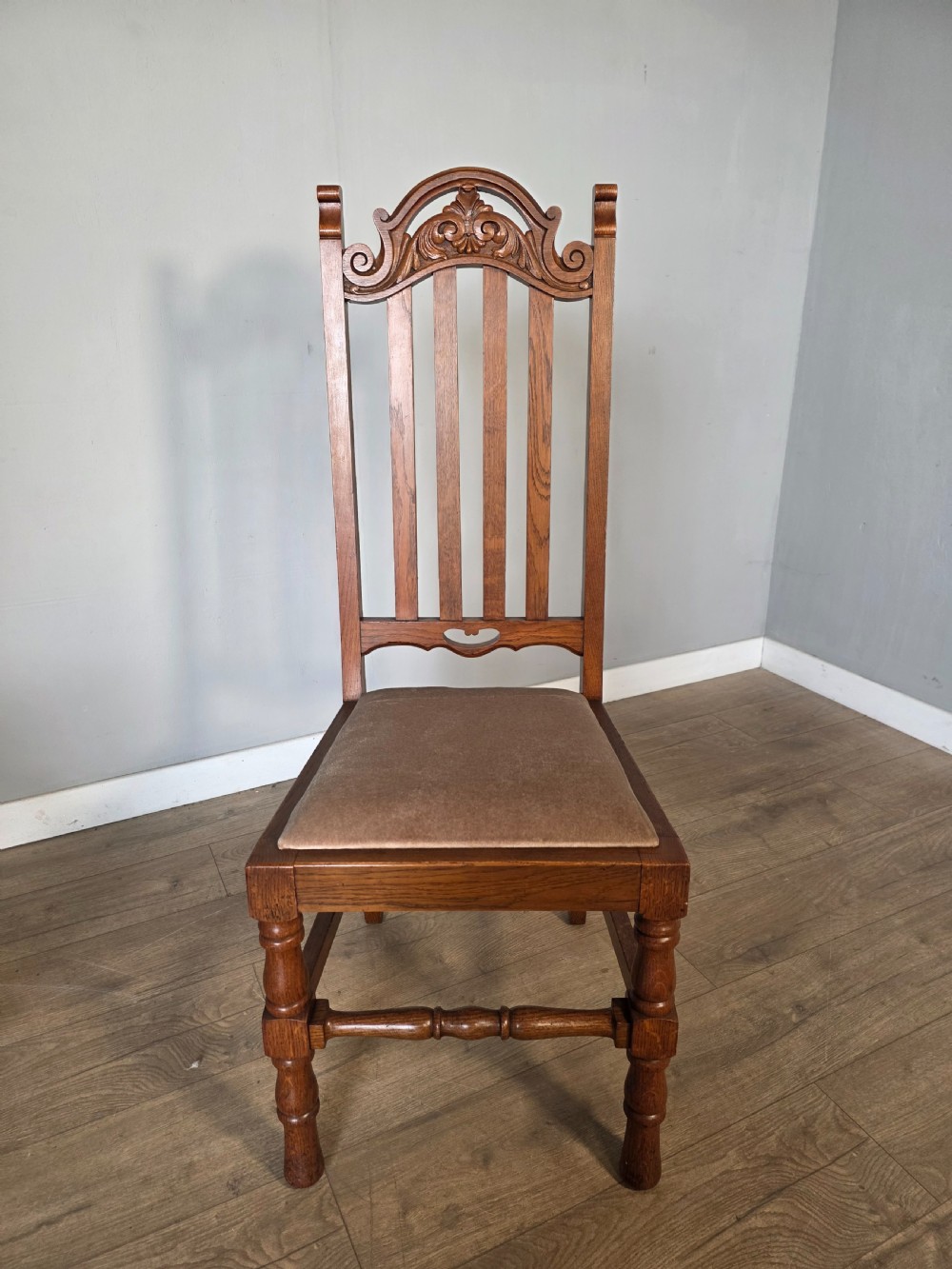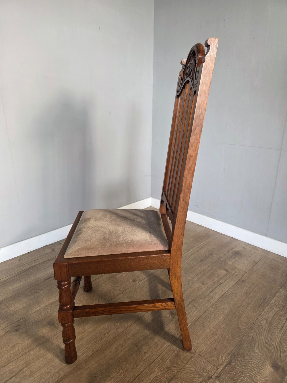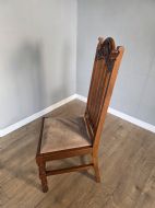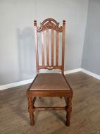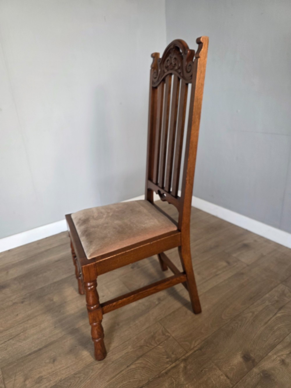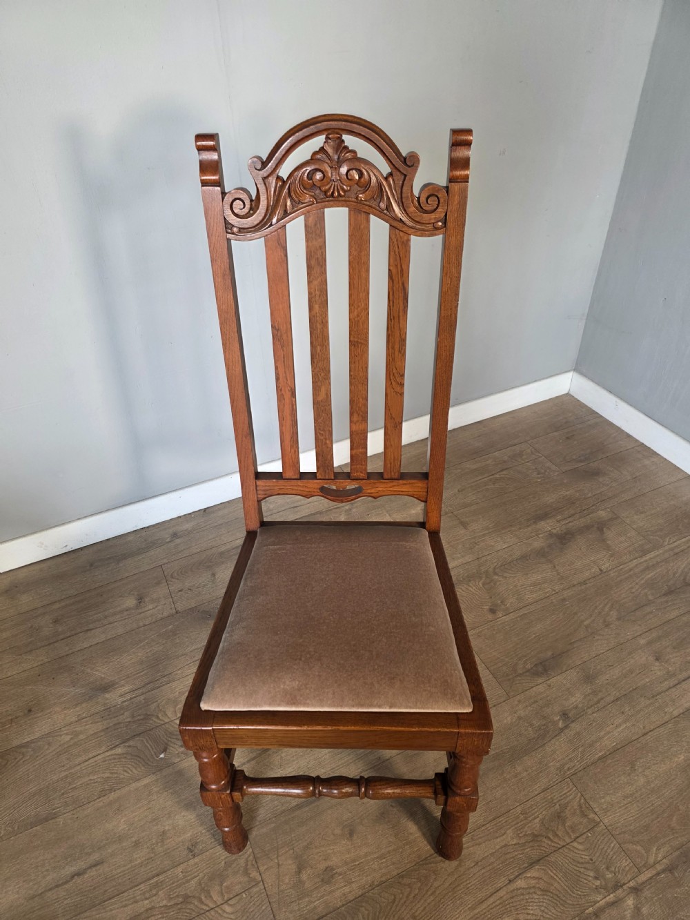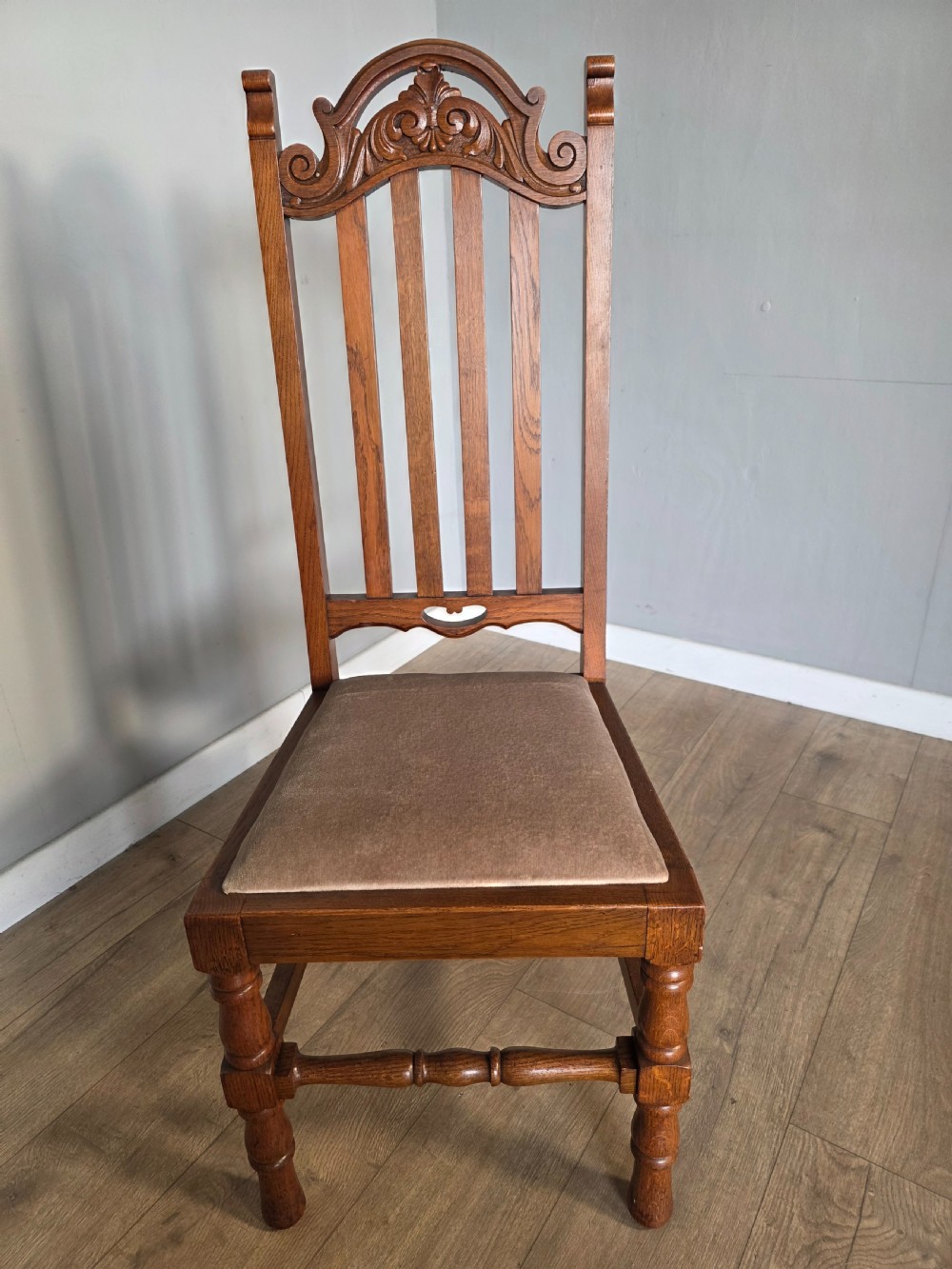 These chairs are a stunning addition to any dining room. Made from solid oak, these chairs have intricate carved detailing and a high back, adding a touch of elegance and sophistication to any dining room. The rich colour of the oak adds a warm and classic touch to the dining space and the sturdy construction ensures durability and longevity. The chairs are both stylish and practical.
