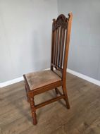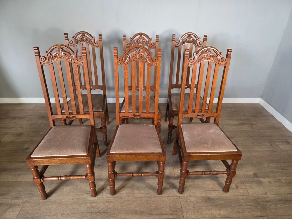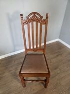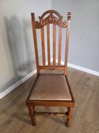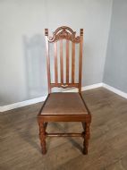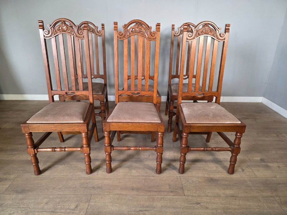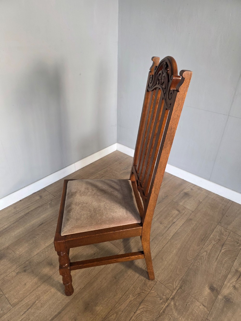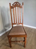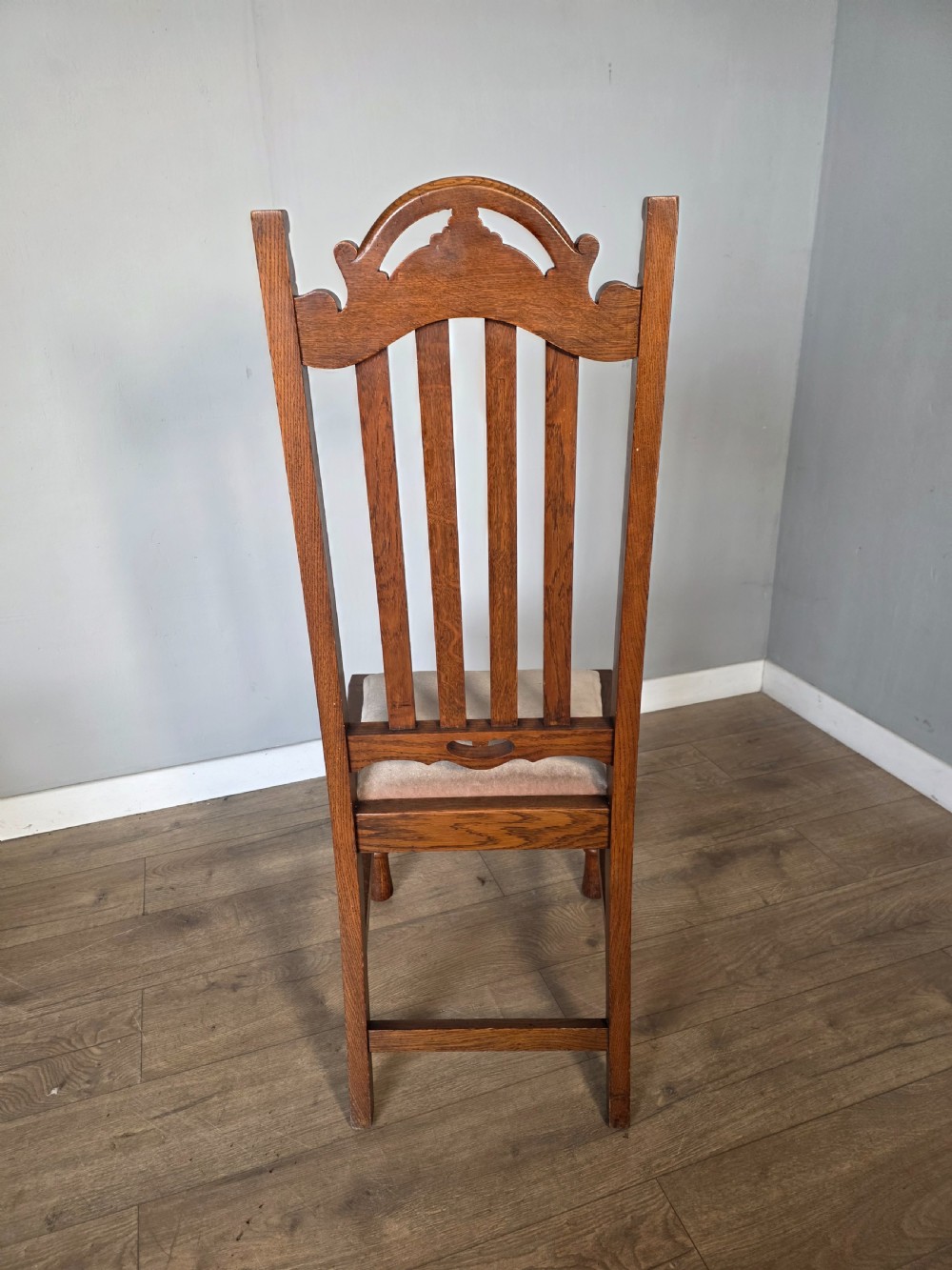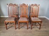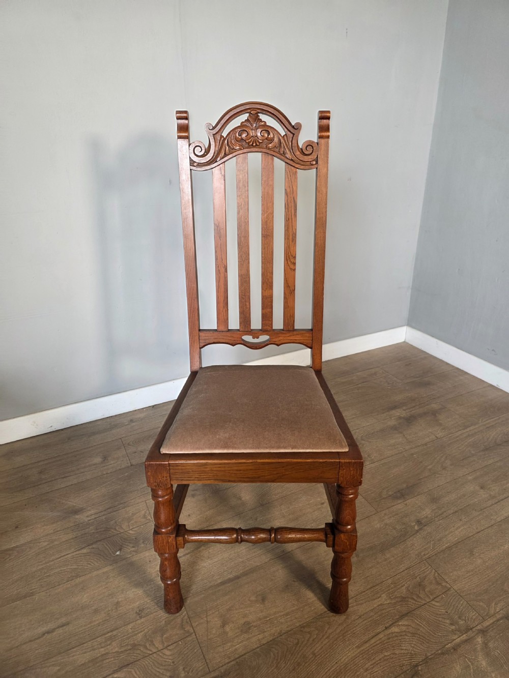 These chairs are a stunning addition to any dining room. Made from solid oak, these chairs have intricate carved detailing and a high back, adding a touch of elegance and sophistication to any dining room. The rich colour of the oak adds a warm and classic touch to the dining space and the sturdy construction ensures durability and longevity. The chairs are both stylish and practical.