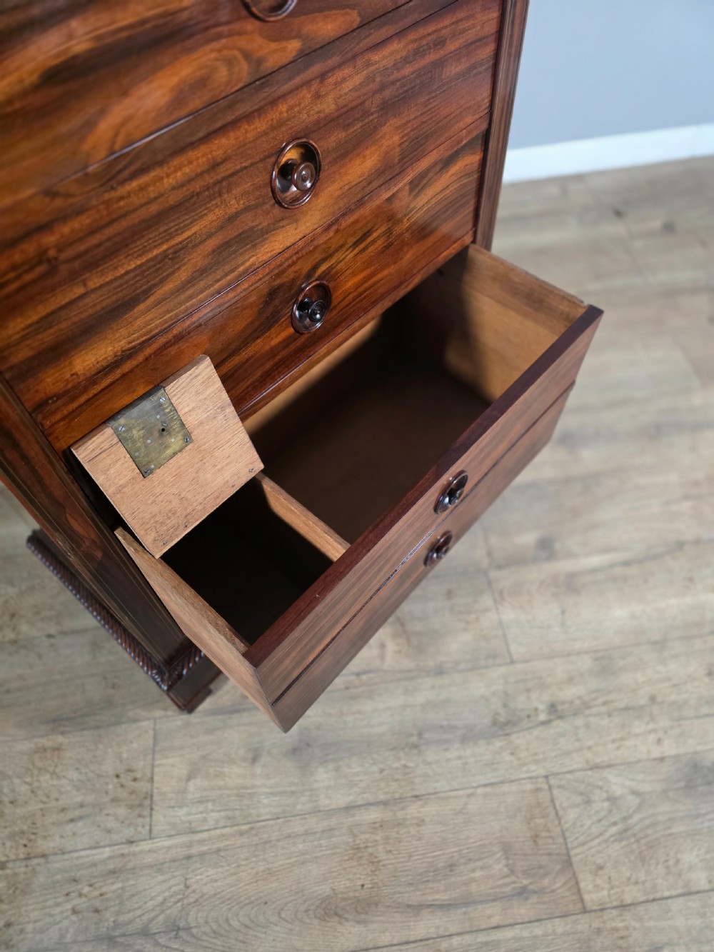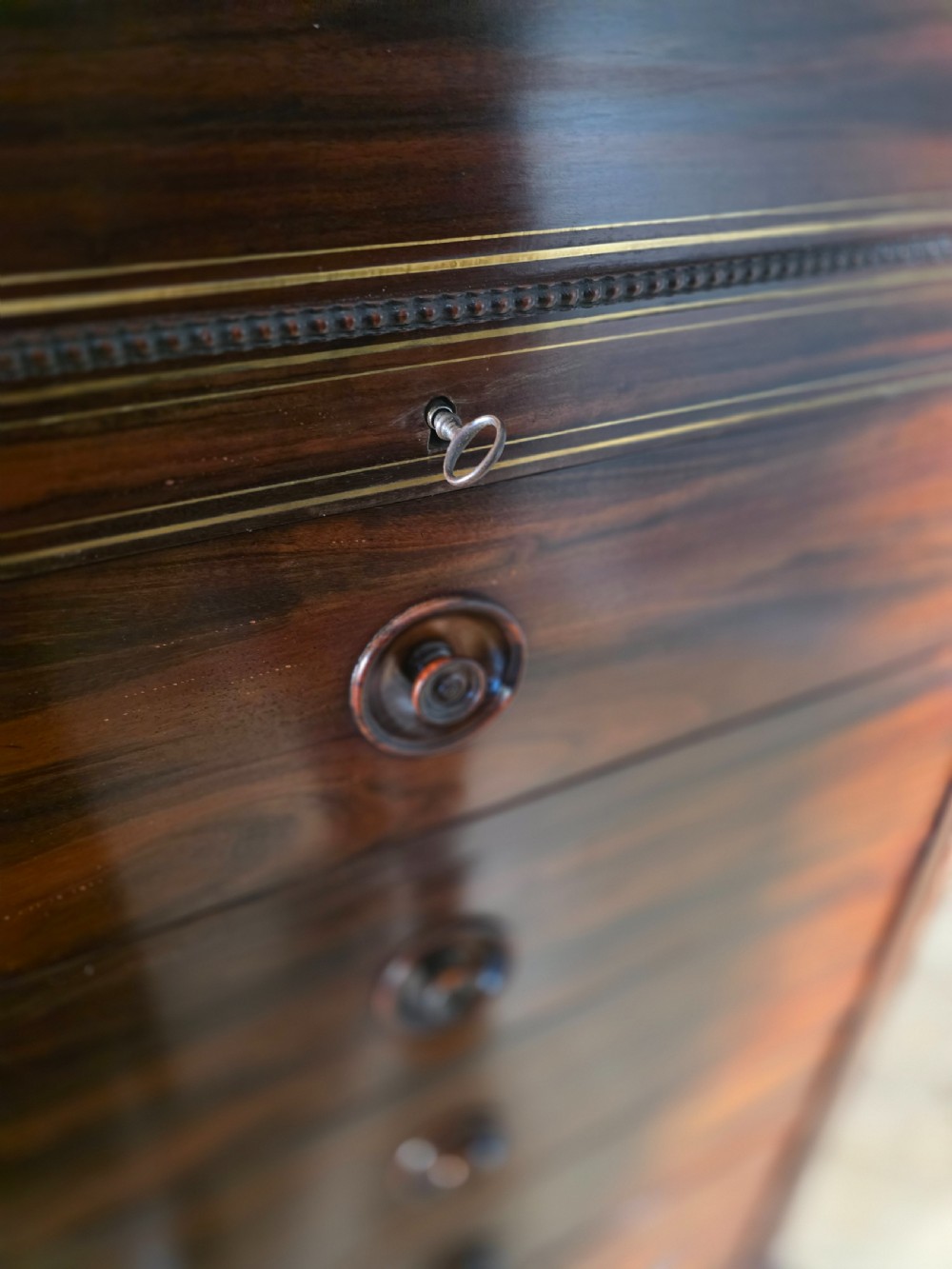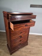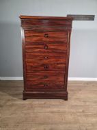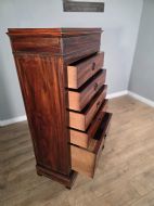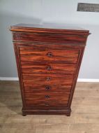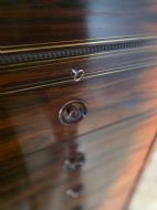 This piece of furniture exudes old-world charm and elegance. The chest of drawers are not only a stylish addition to any room but also offers ample storage space. The intricate brass inlays and rosewood construction adds a touch of luxury to this piece, making it a timeless and classic chocie for antique furniture enthusiasts.