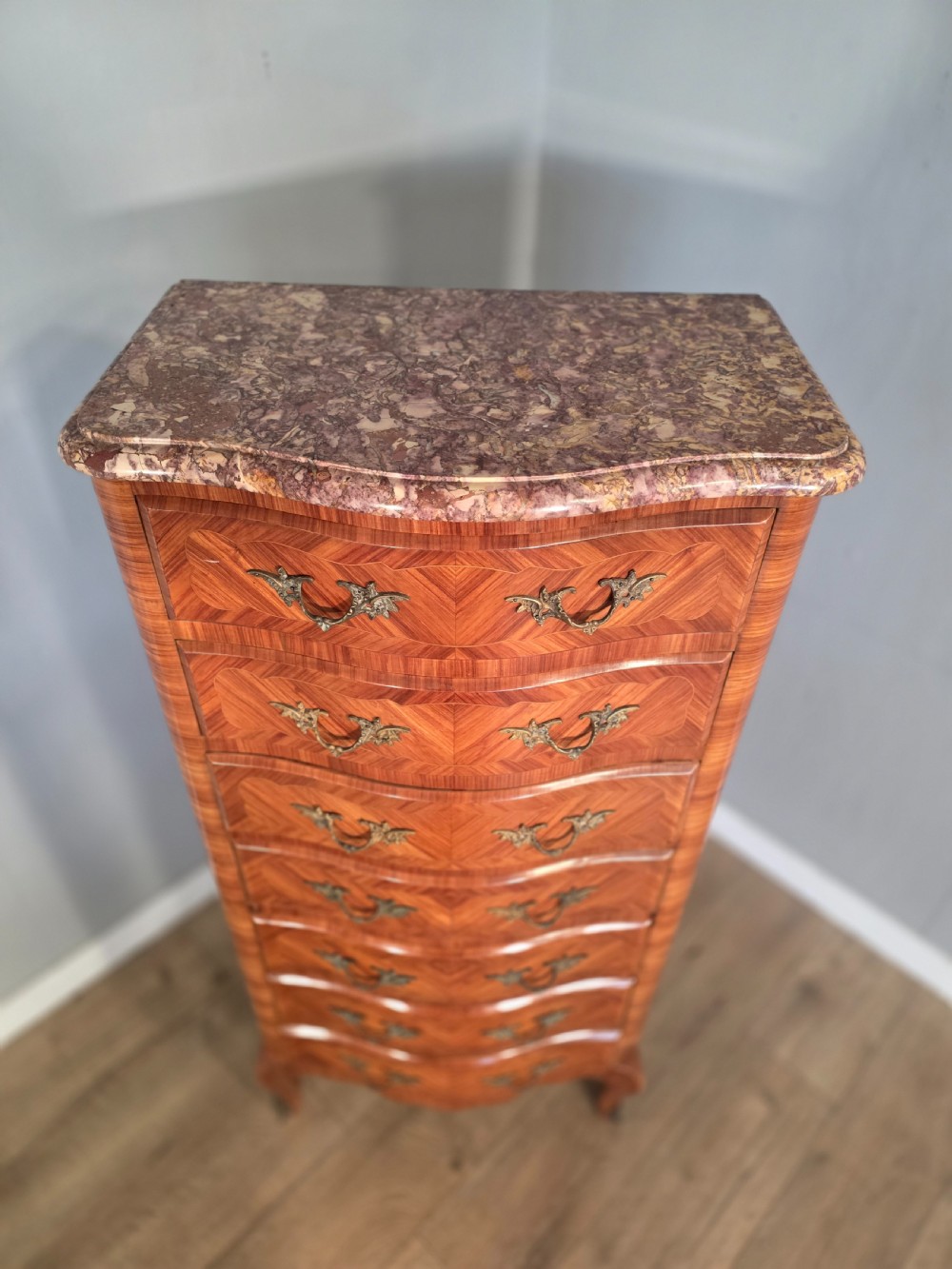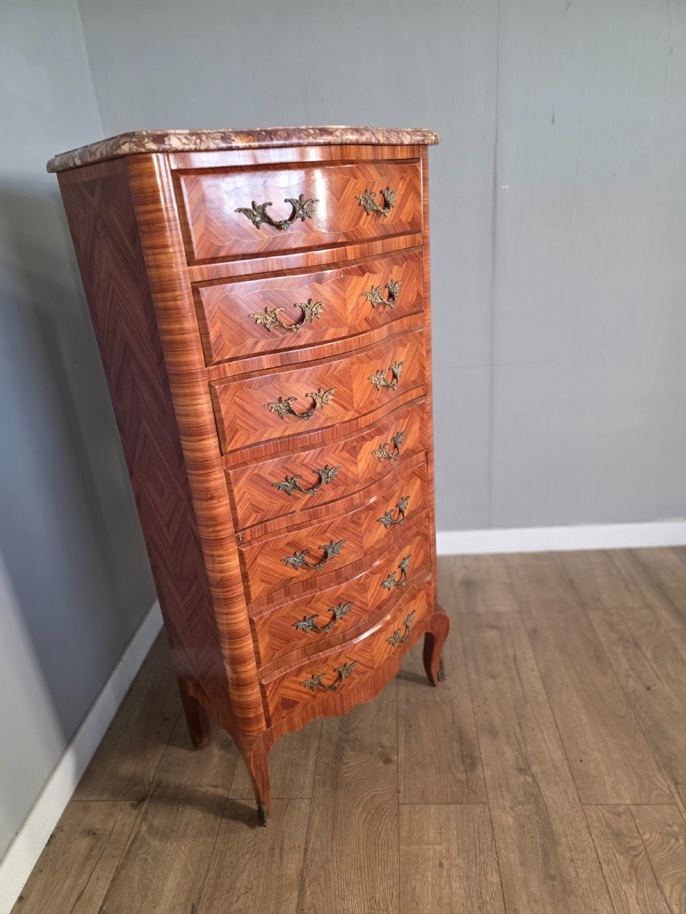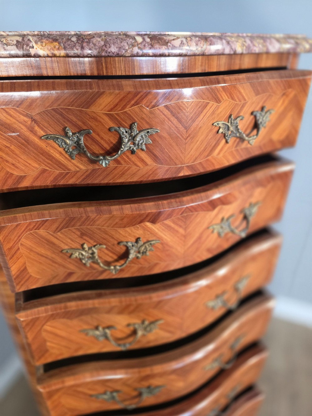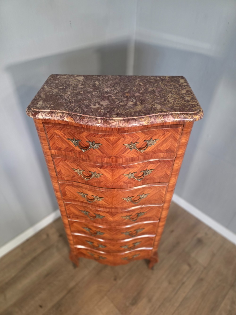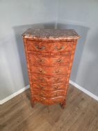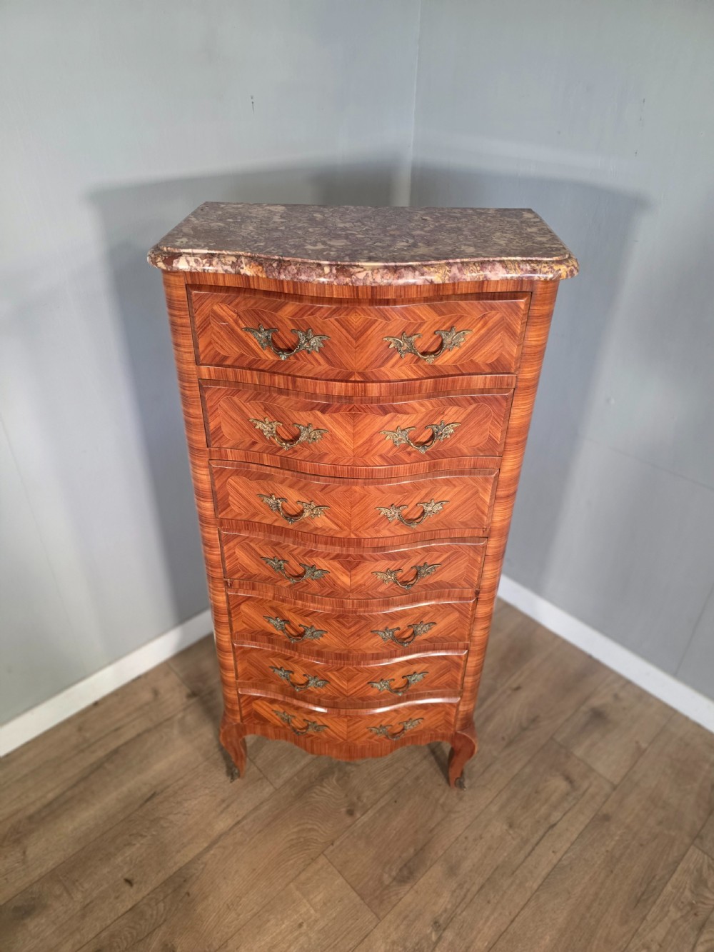 Antique French Inlaid Marble Top 7 Drawer Chest 1930s