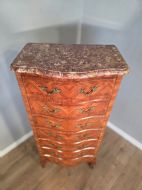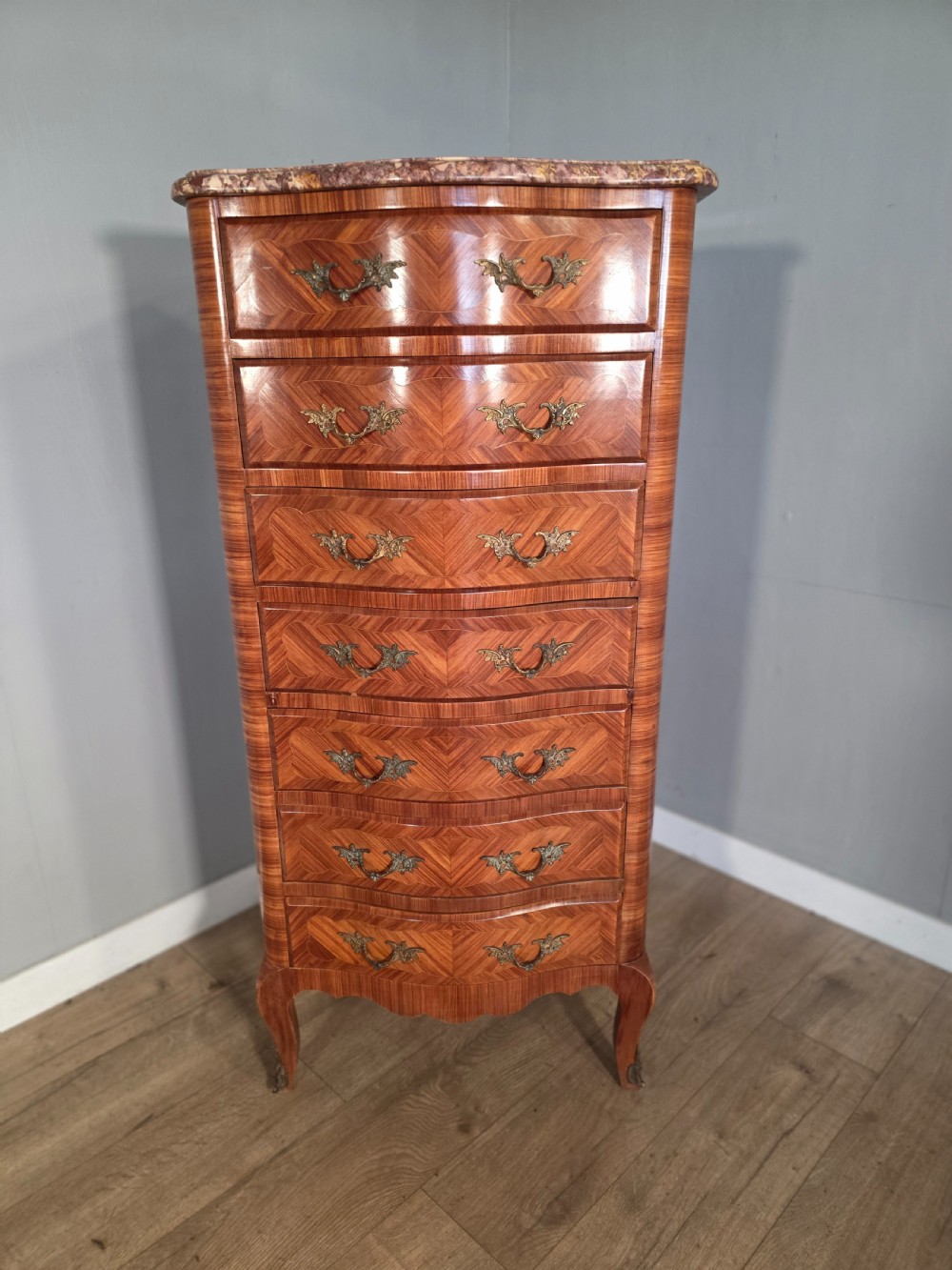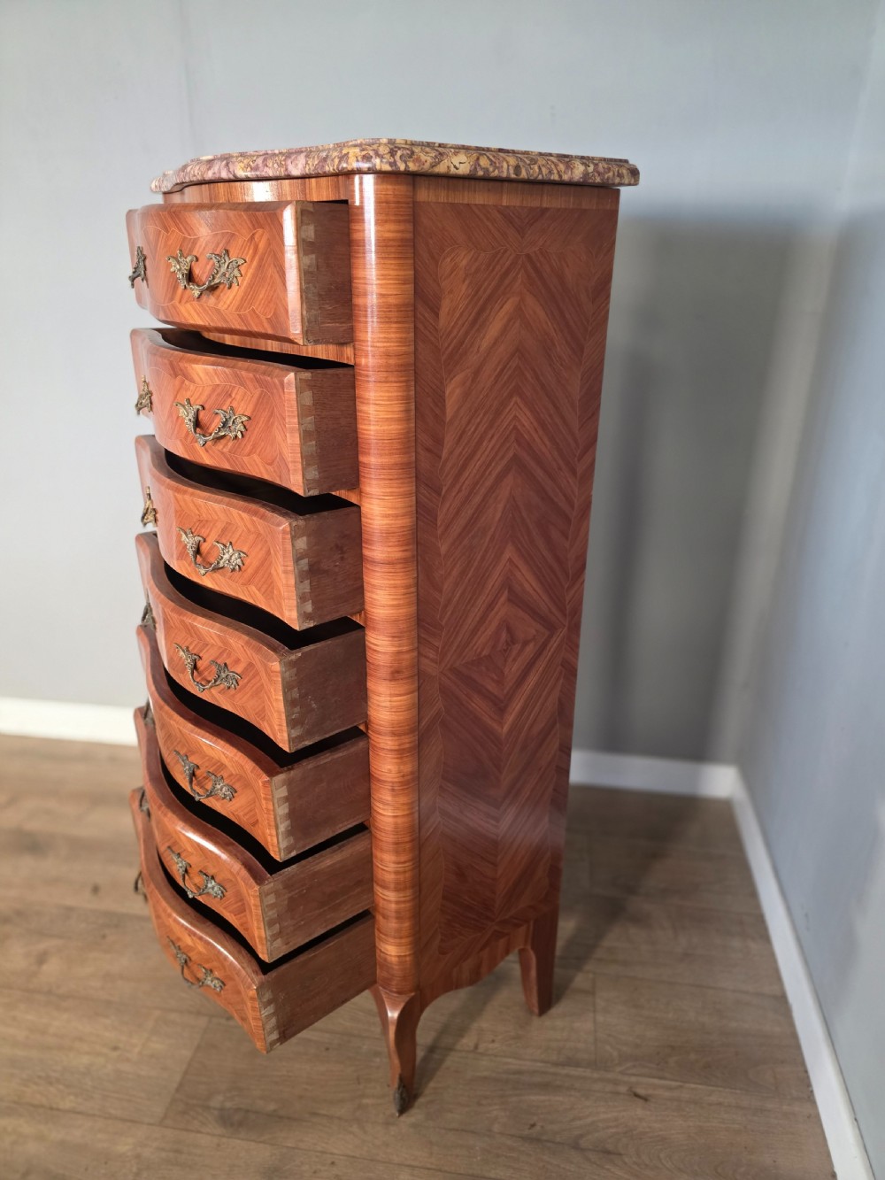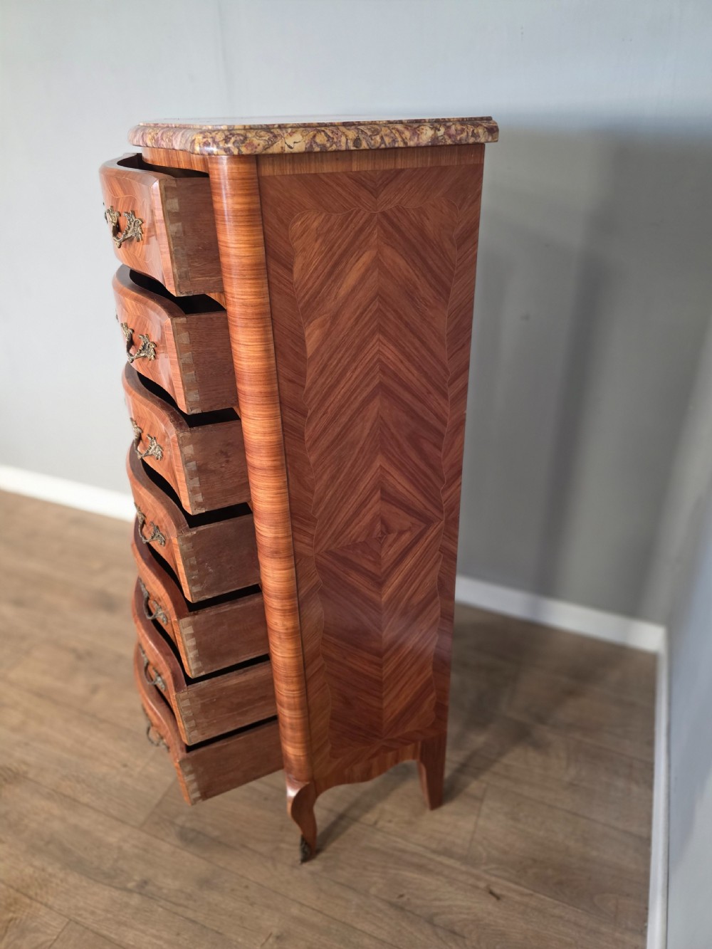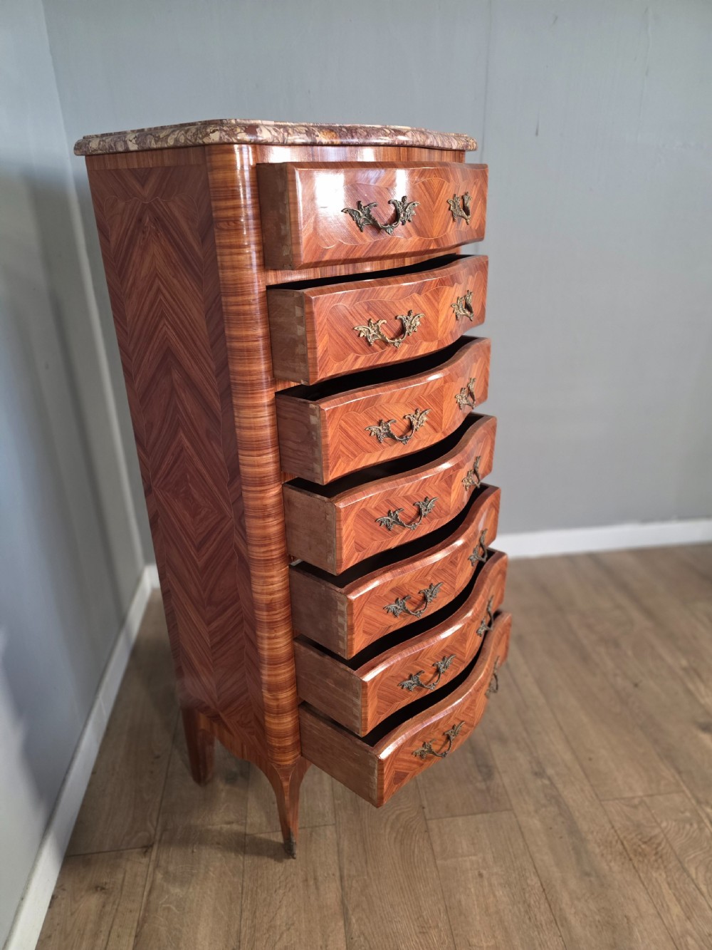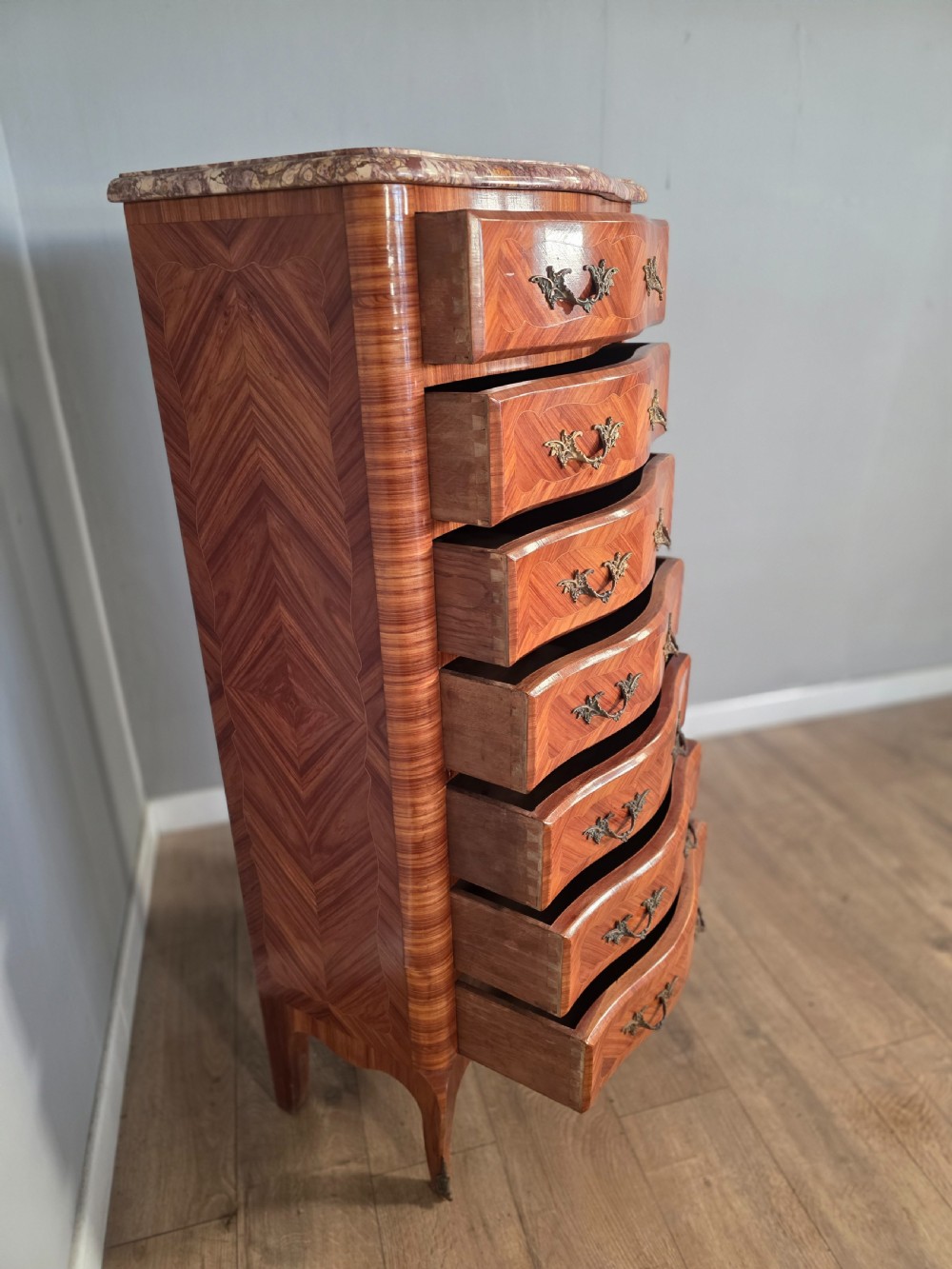 Antique French Inlaid Marble Top 7 Drawer Chest 1930s