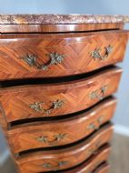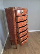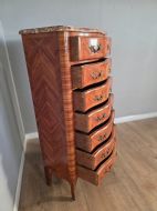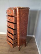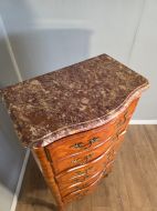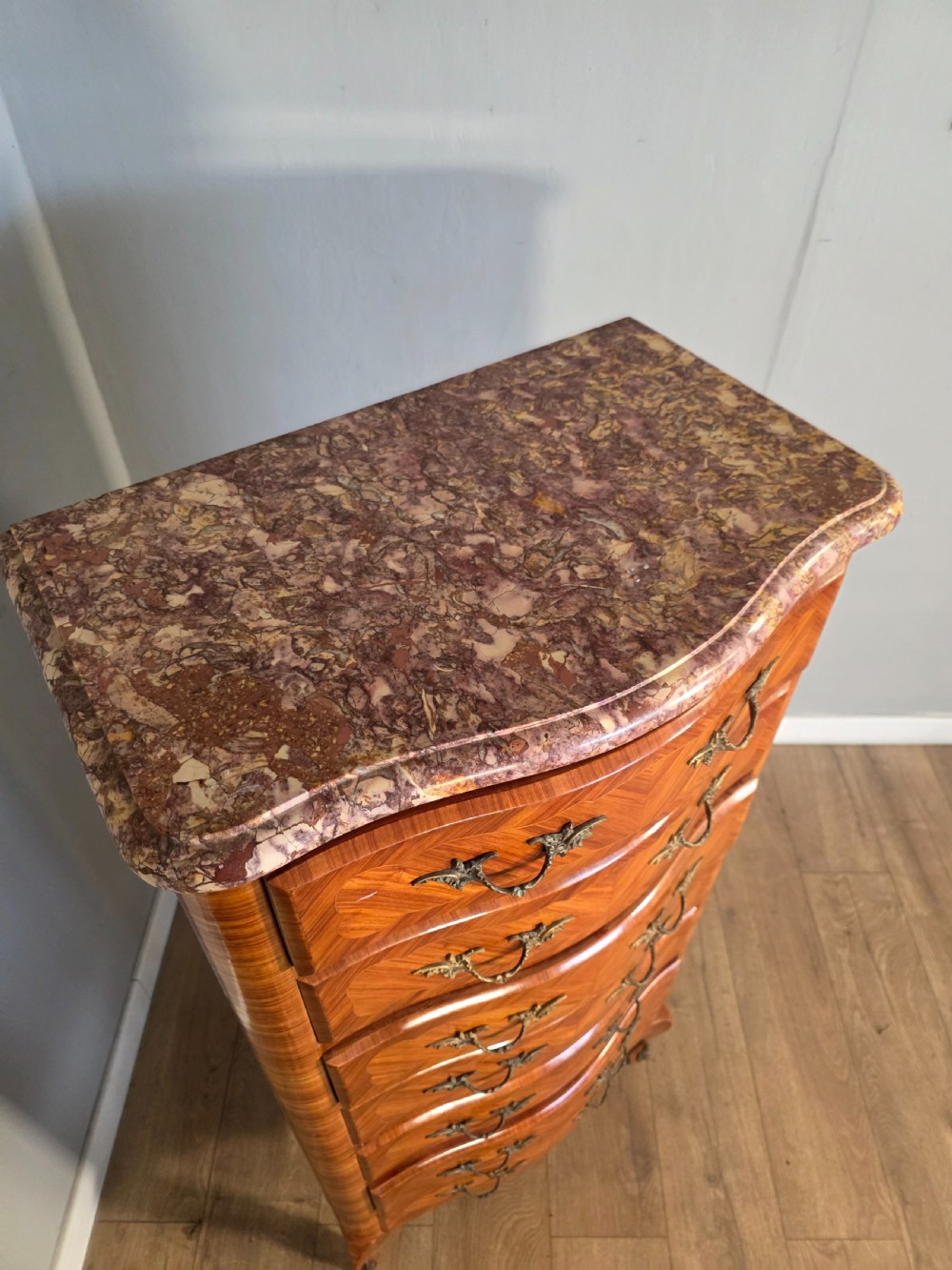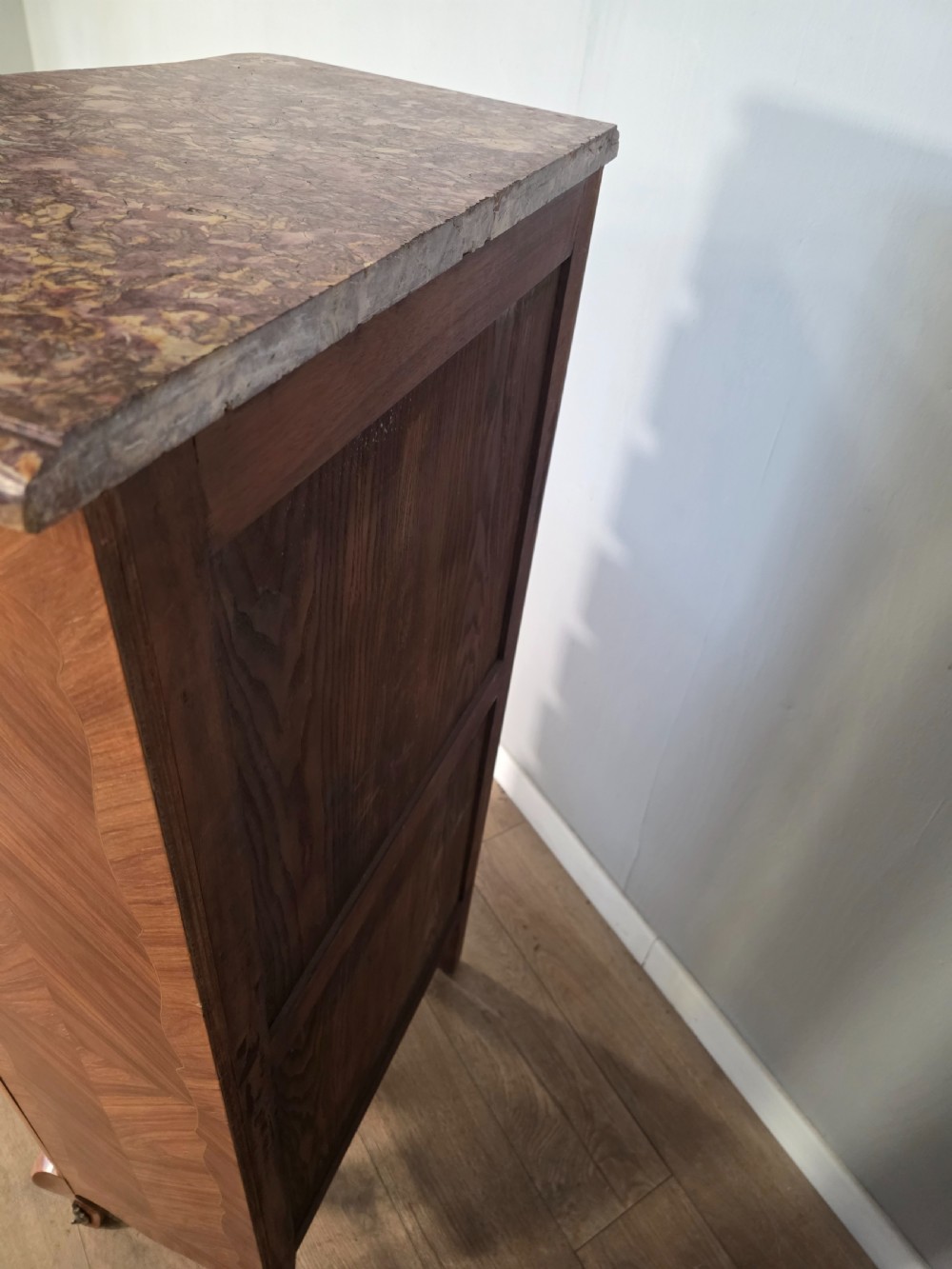 This 1930s chest exudes old-world charm and sophistication. With its elegant French design and intricately inlaid marble top, this chest of drawers adds a touch of timeless style to any room. The chest comes with solid oak drawer linings. This chest is a stunning addition for those who appreciate classical and antique furniture.