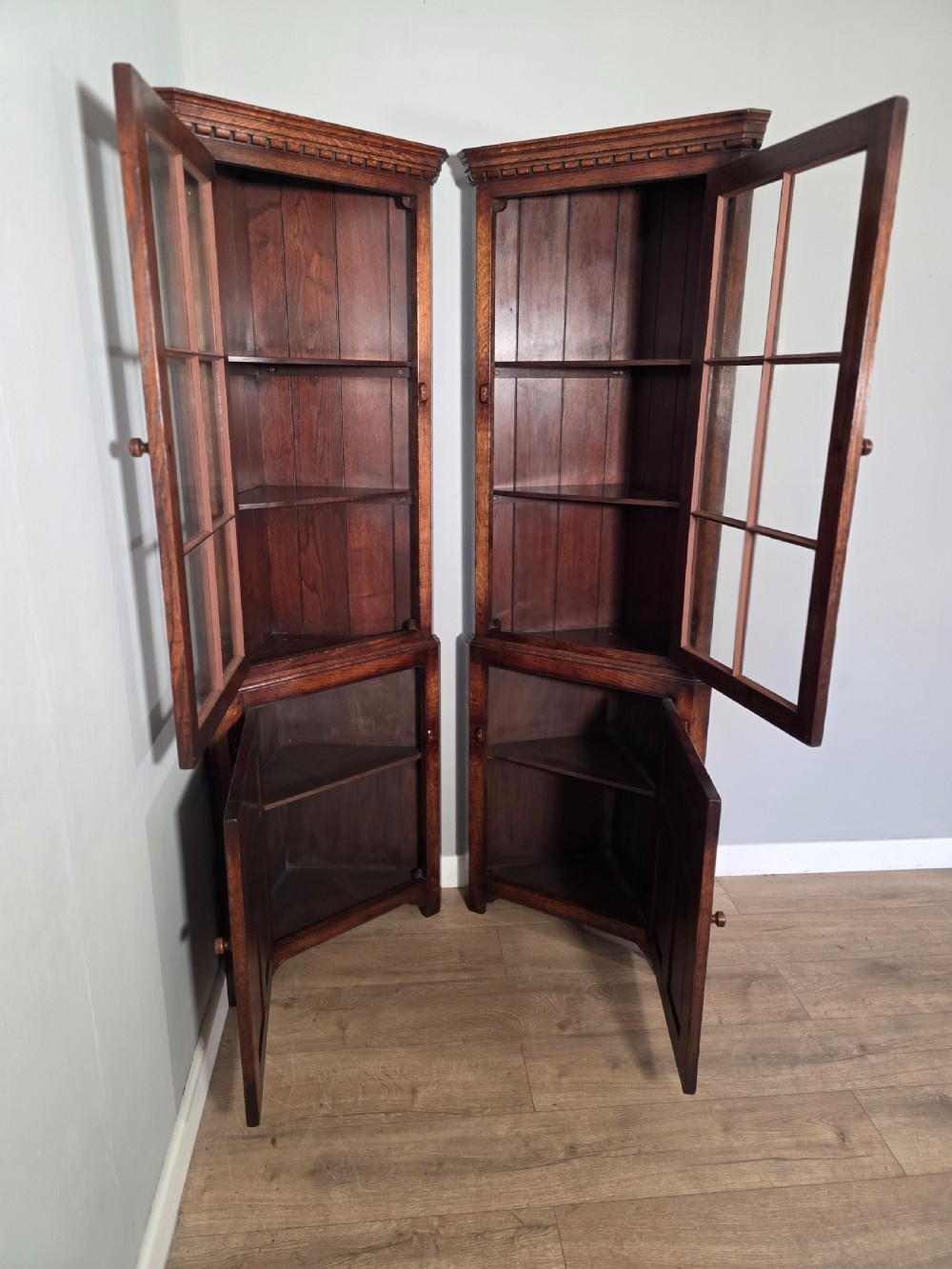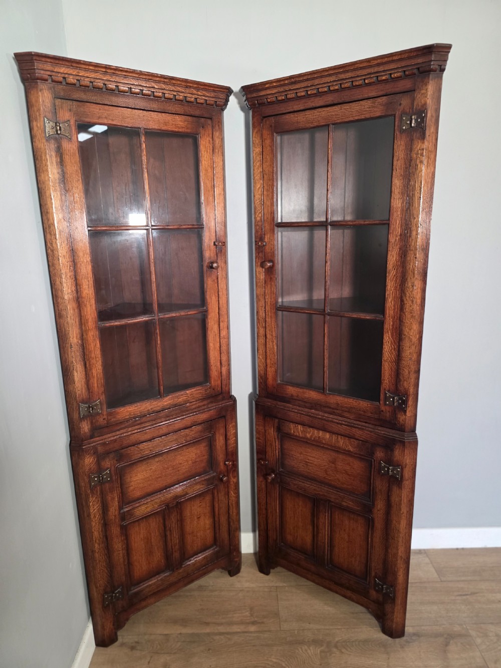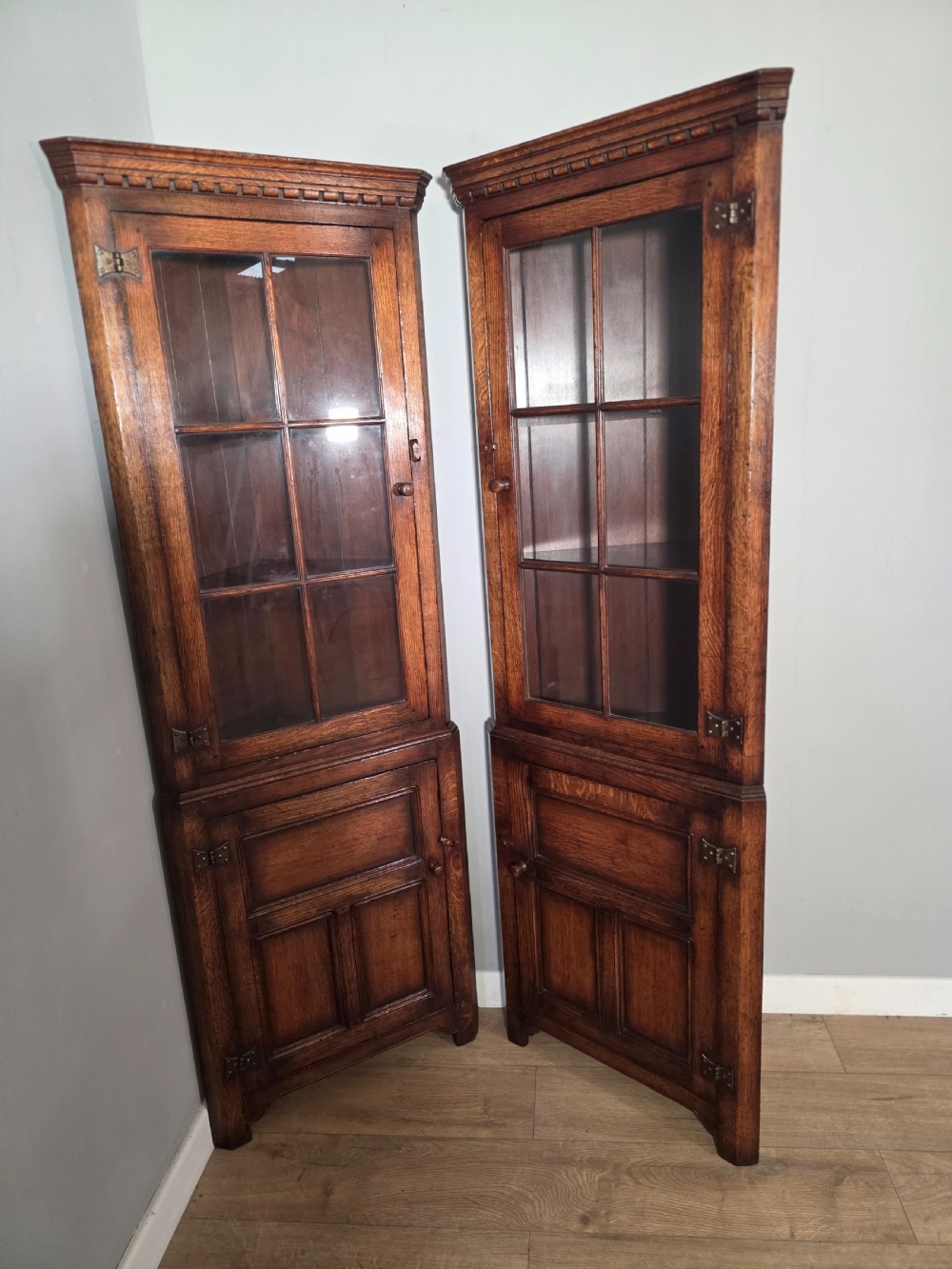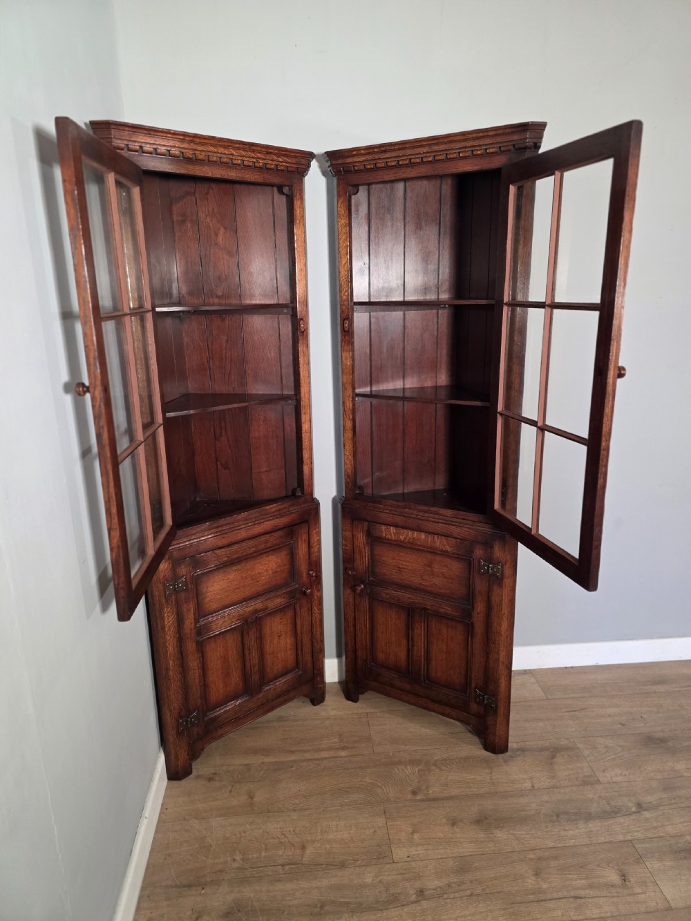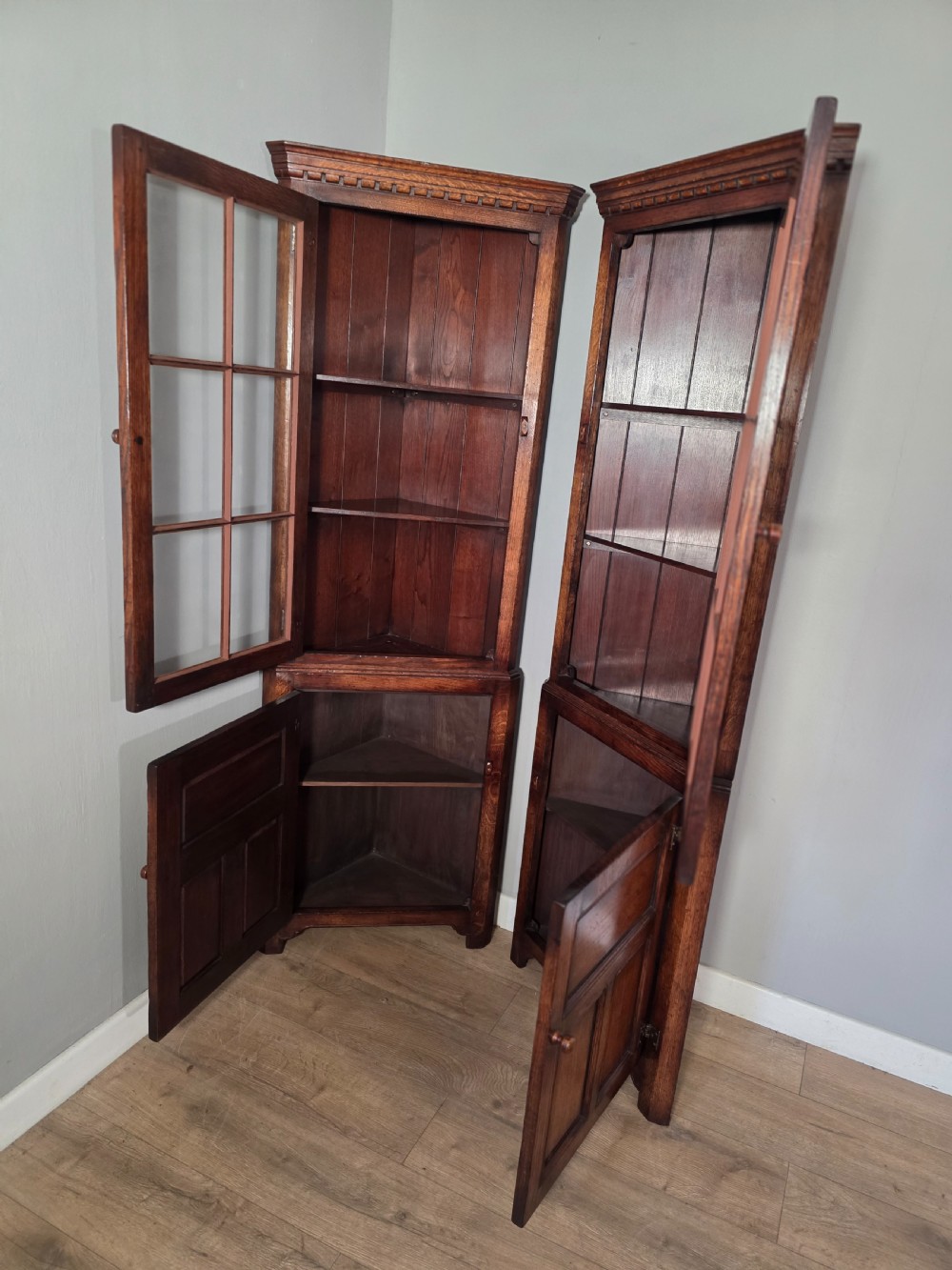 antique 1980s matching pair of solid oak titchmarch goodwin corner cupboards