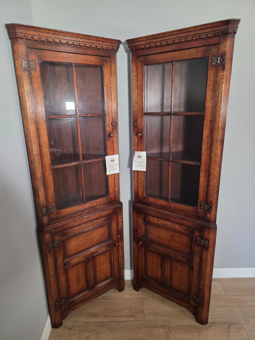 A rare and unique pair of antique 1980s solid oak corner cupboards by Titchmarch and Goodwin. These cupboards are both functional and stylish. Crafted from solid oak they offer a timeless and classic addition to any antique or traditional furniture collection. These are in excellent condition and cost in the excess of £5000 new.