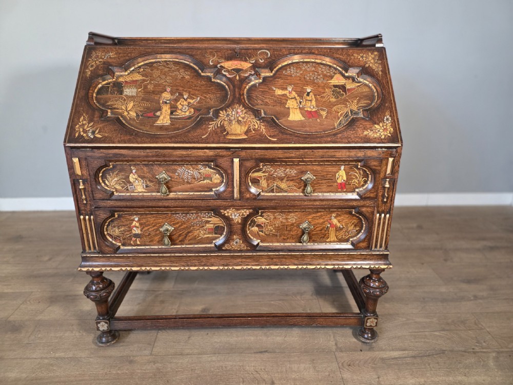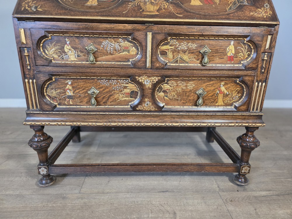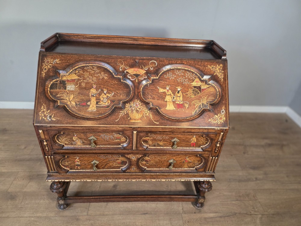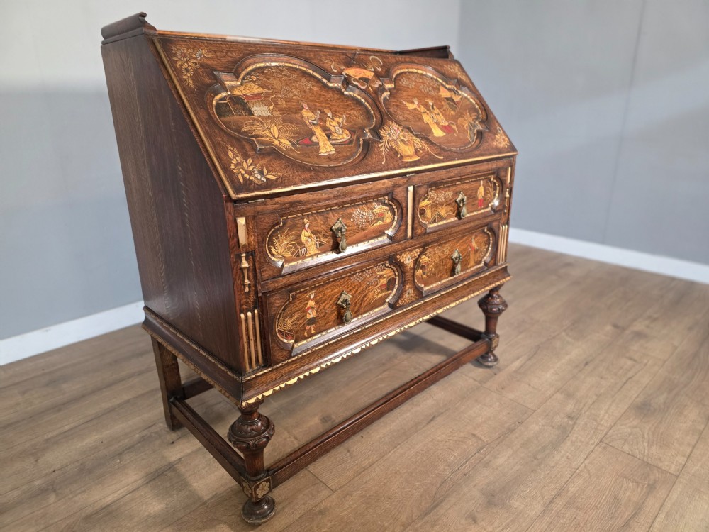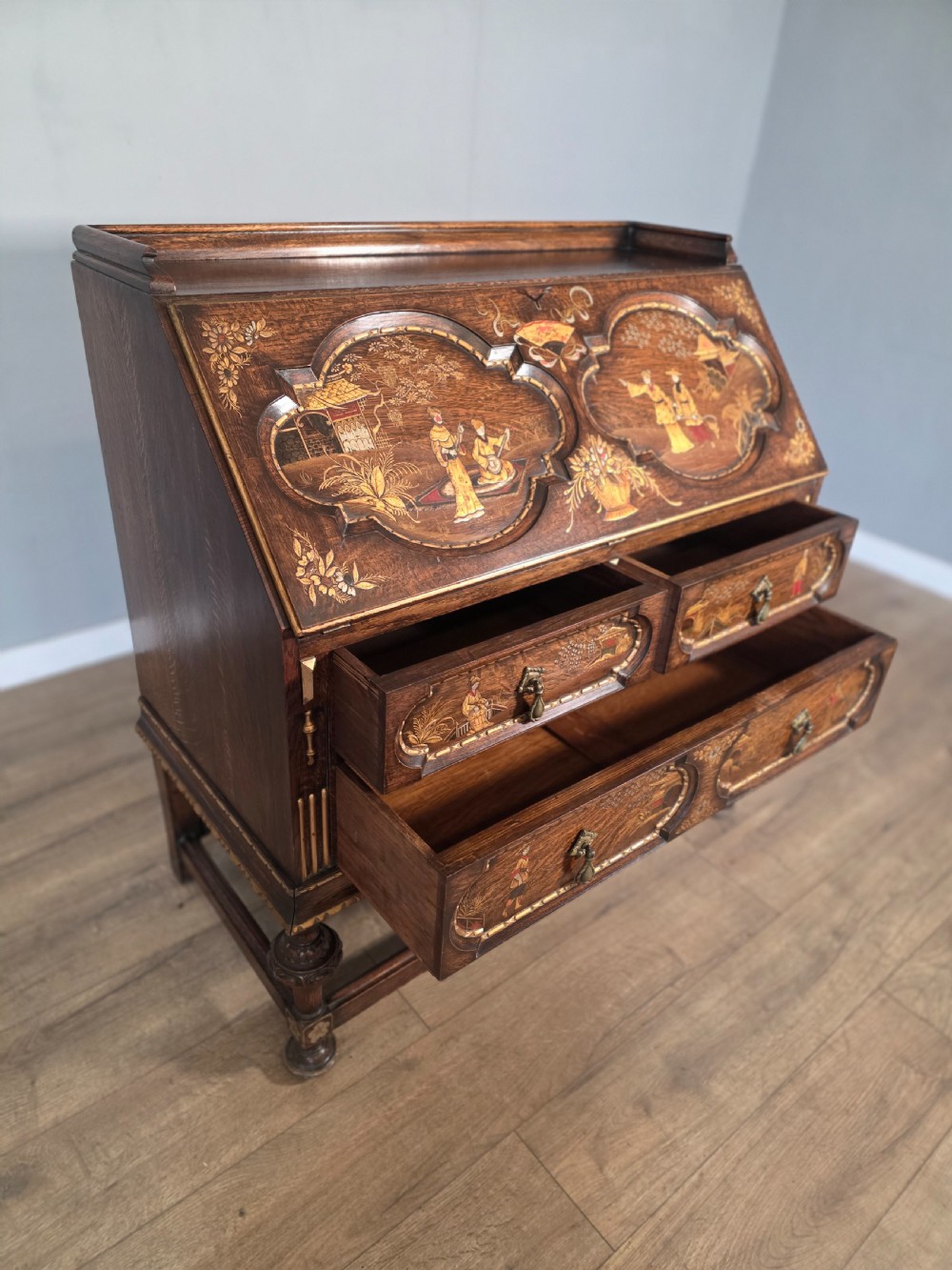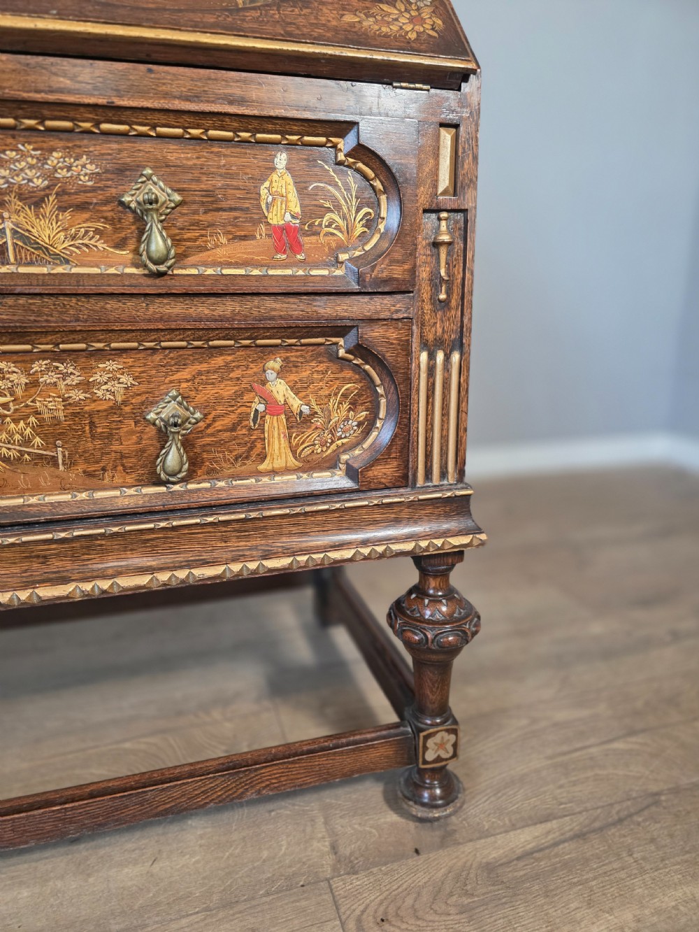 This antique solid oak bureau from the 1920s exudes classic charm and sturdy construction. It offers ample storage space for books, trinkets and more. This bureau bookcase is a timeless addition to any antique furniture collection. A beautiful Japanese scene and solid oak throughout.