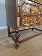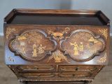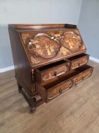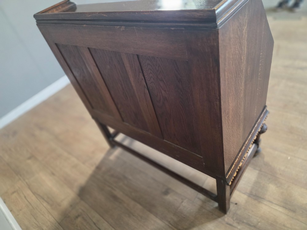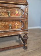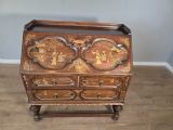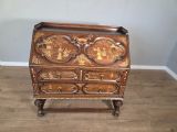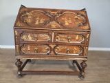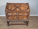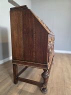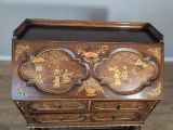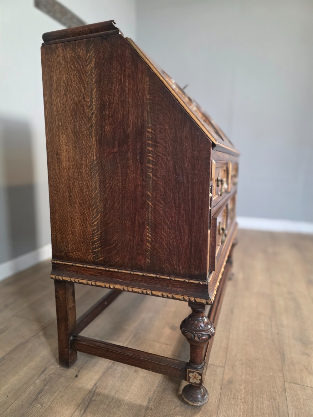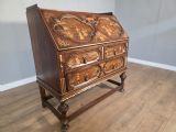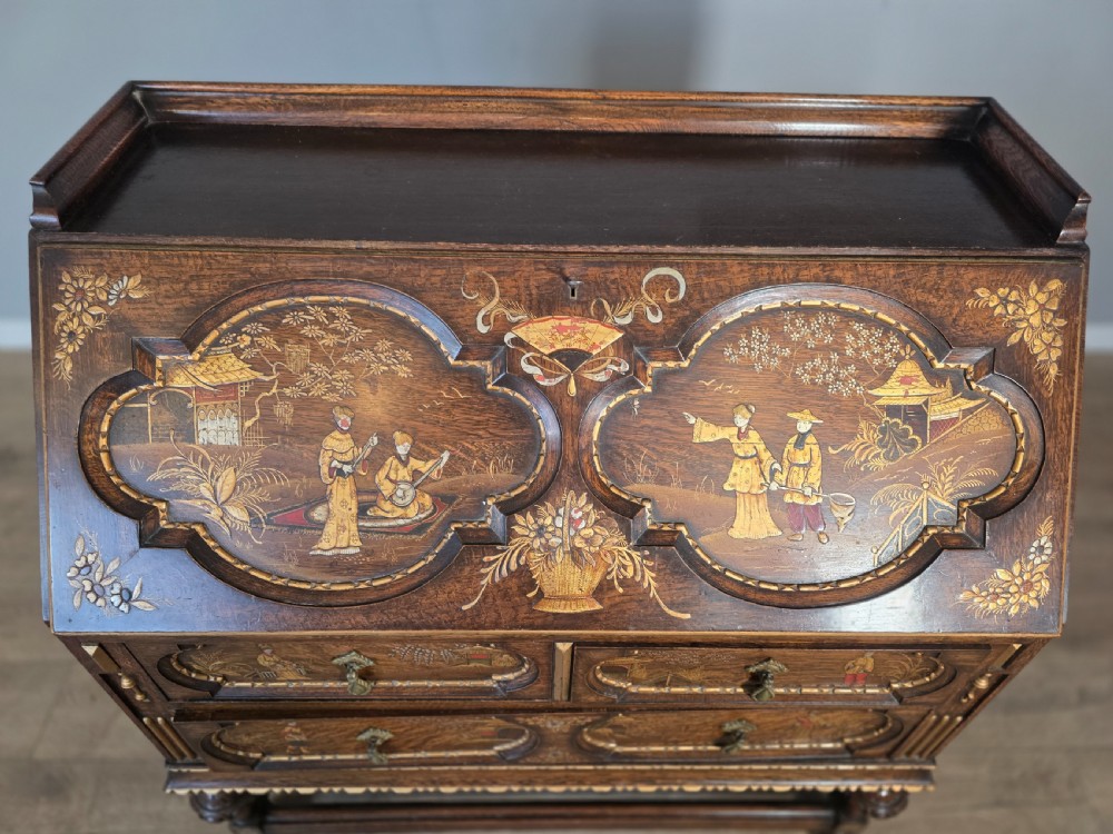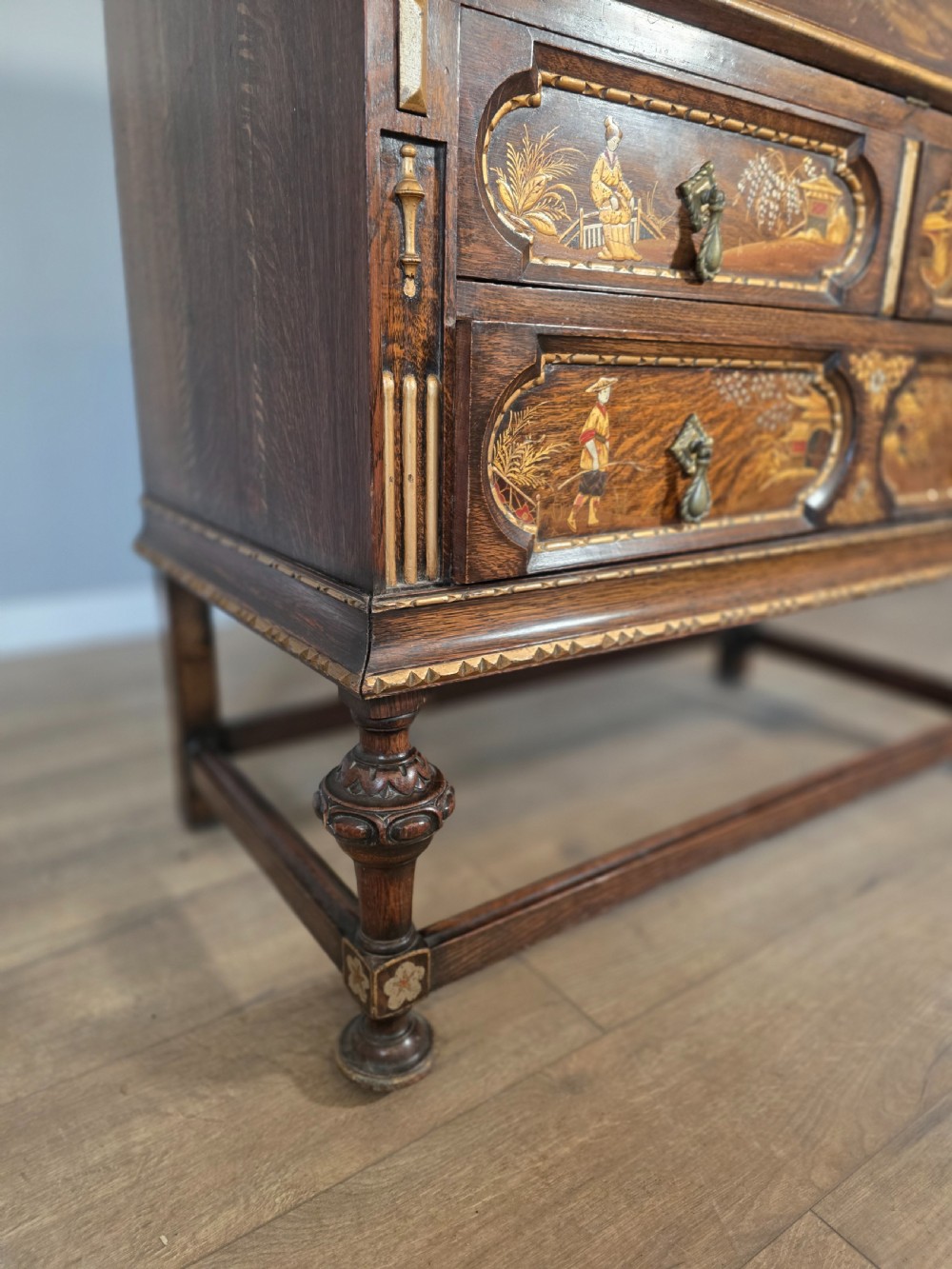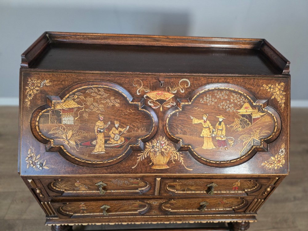 This antique solid oak bureau from the 1920s exudes classic charm and sturdy construction. It offers ample storage space for books, trinkets and more. This bureau bookcase is a timeless addition to any antique furniture collection. A beautiful Japanese scene and solid oak throughout.